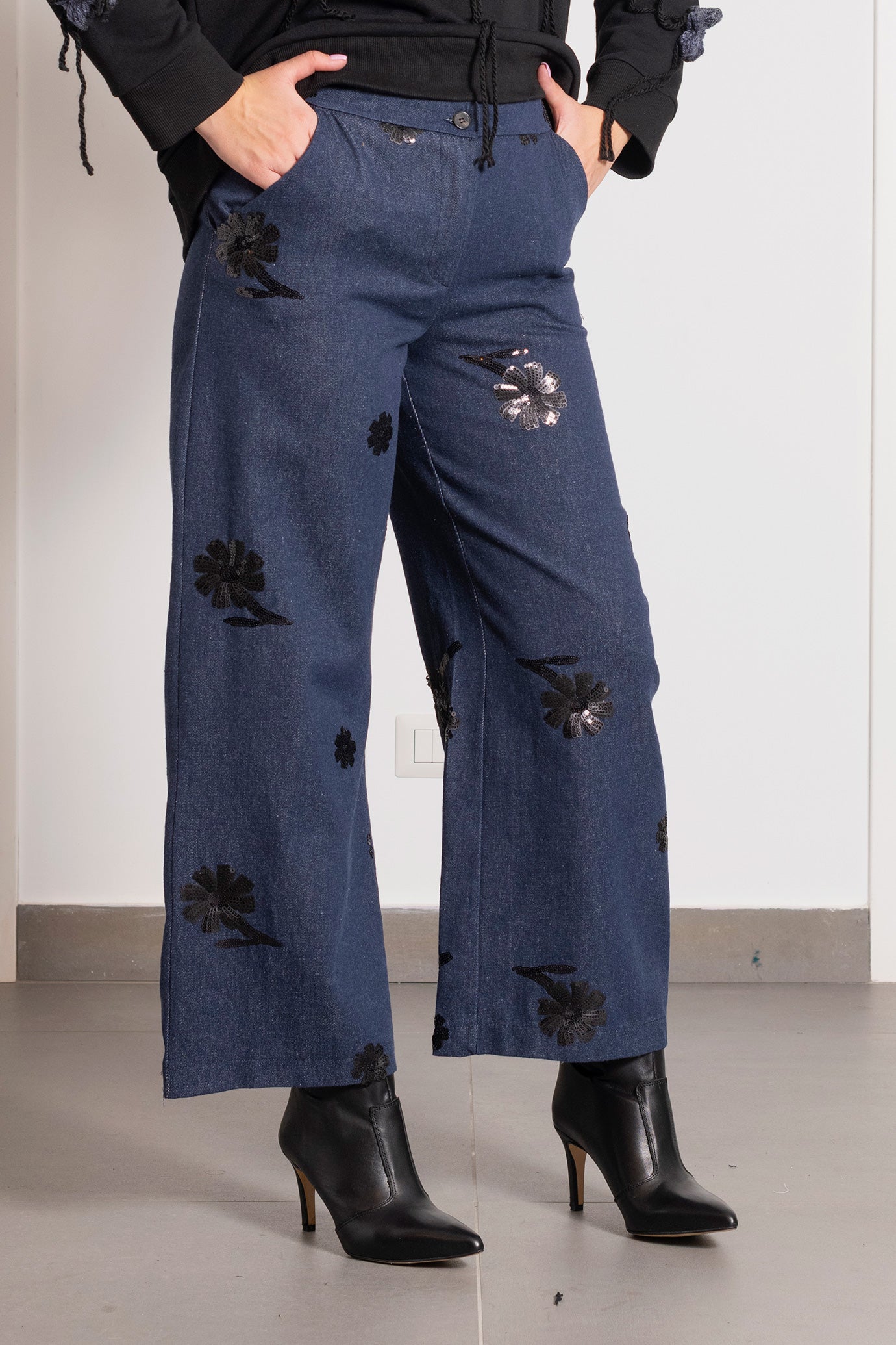 Pantalone Jeans blu ricamato Le Streghe con pailettes nero codice MV201/0444