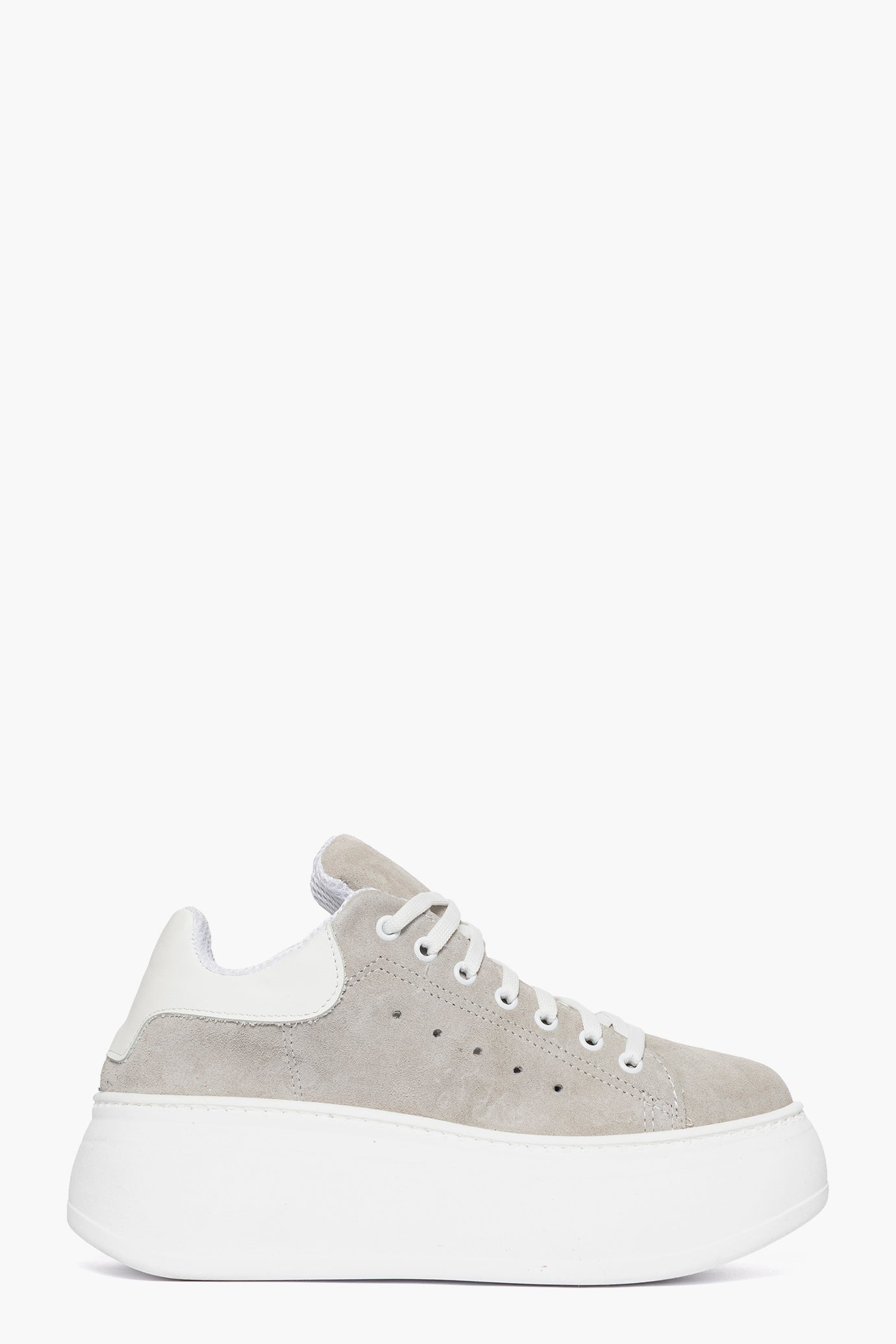 Sneakers in camoscio grigio chiaro con riporto in pelle bianca, lacci ed occhielli in bianco, interni in spugna bianca, sottopiede morbido, pianta larga. Calzata comoda, non prendere un numero in più, suola in gomma bianca, altezza 6 cm. Calzature realizzate artigianalmente, rigorosamente made in Italy.