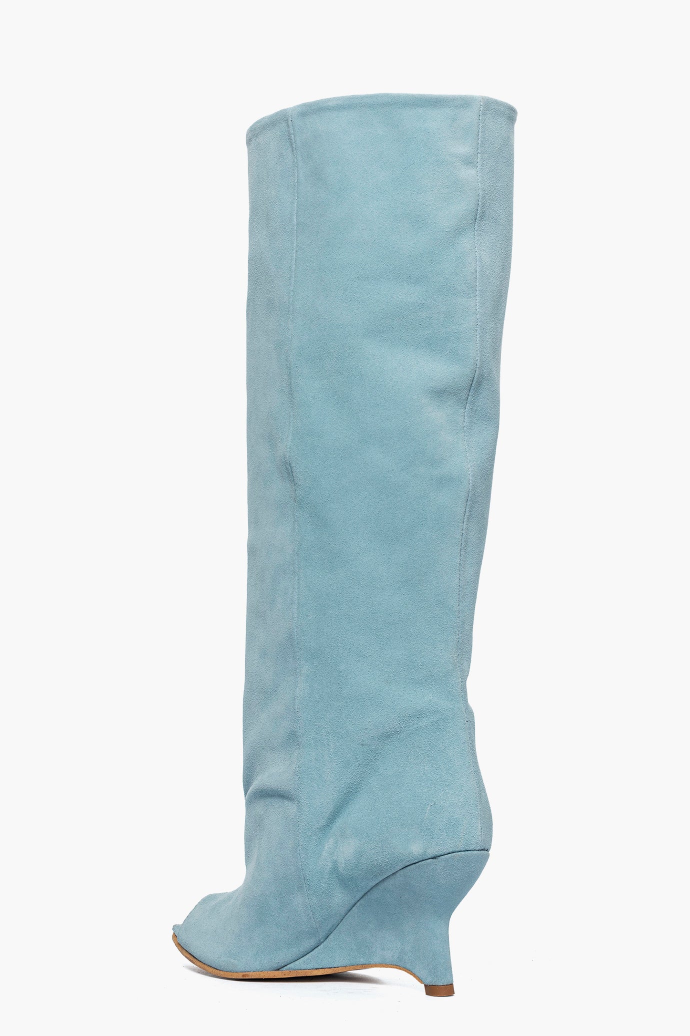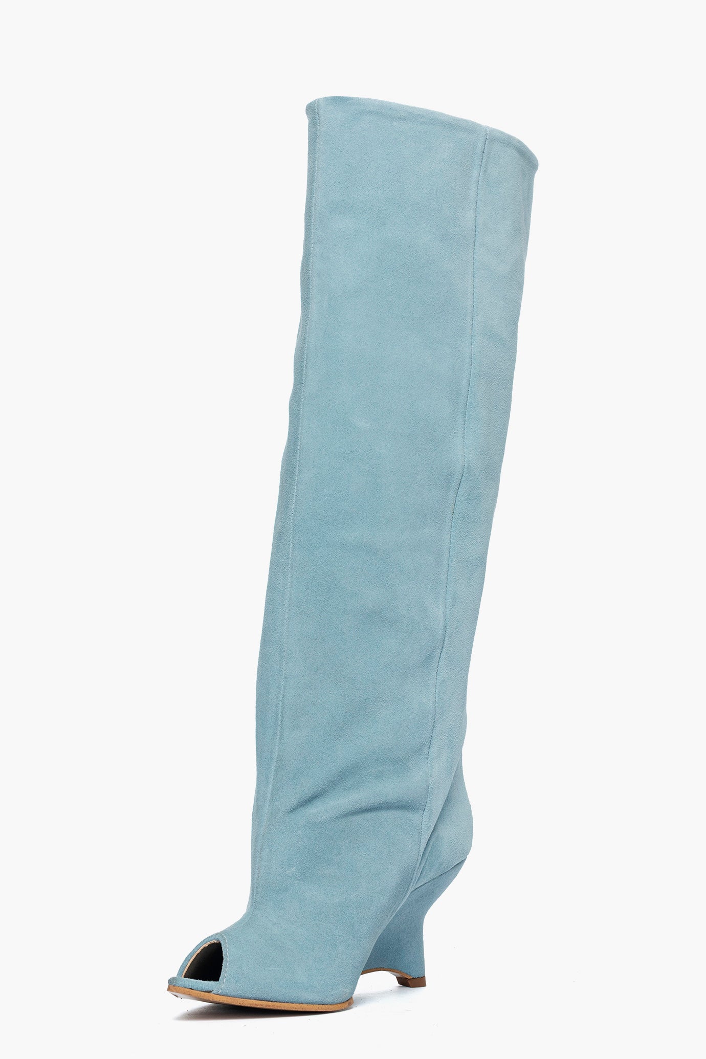 Stivale con gambale ampio circa 46/48 cm in camoscio azzurro, punta aperta, in avanti punta sottile, privo di cerniera, interni in similpelle, zeppa rivestita, altezza 8,5. Calzano giusti, punta stretta. Calzature artigianali, made in Italy.