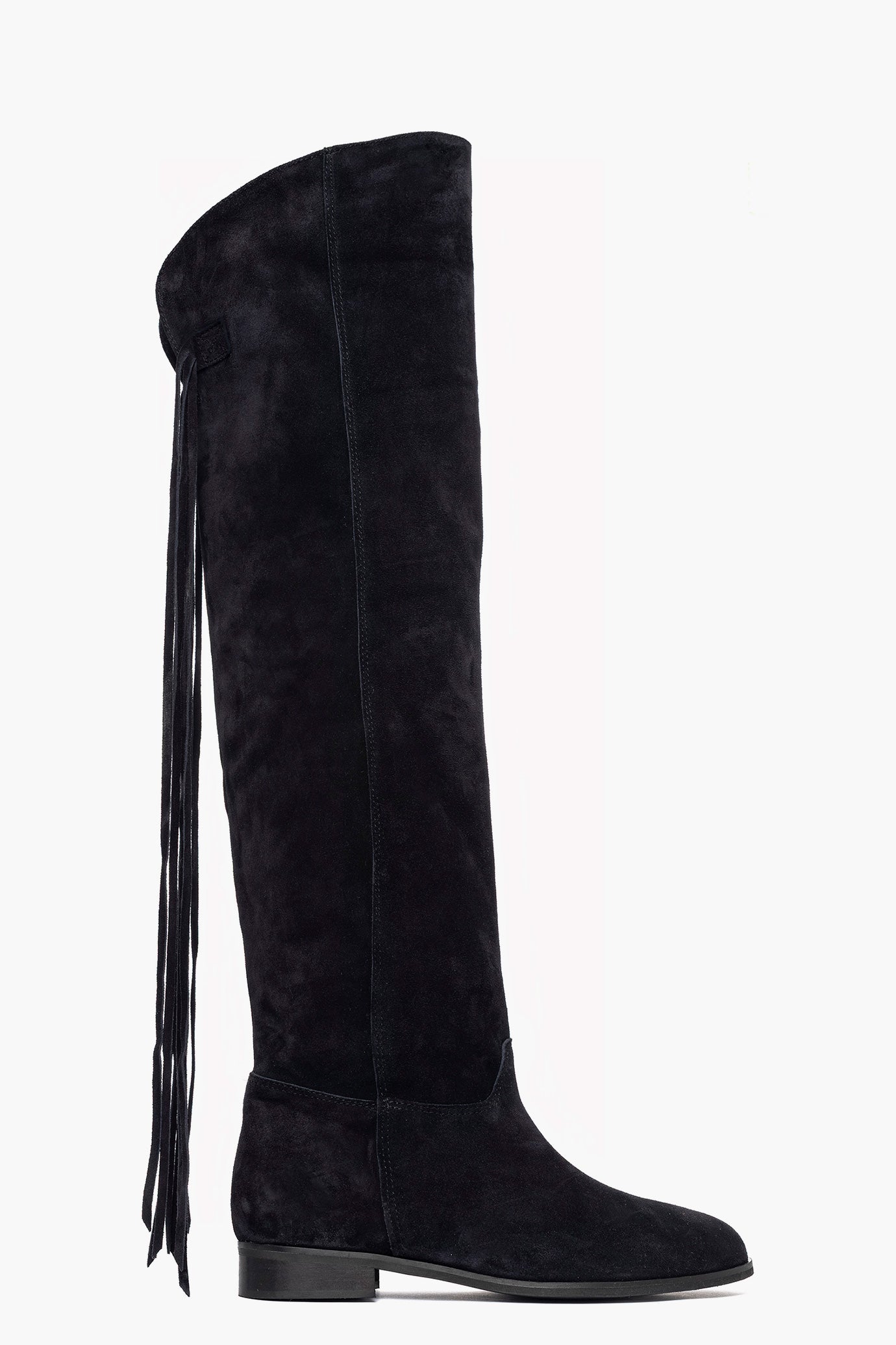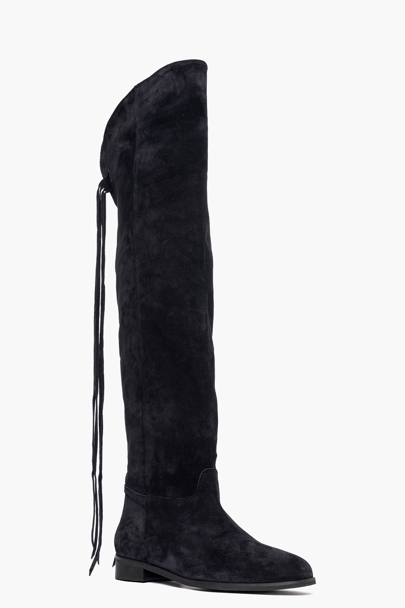 Stivali alti, modello 273, in camoscio blu scuro con lacci pendenti sul retro, interni e sottopiede in similpelle, tacco 3 cm. Calzata regolare. Calzature realizzate artigianalmente, rigorosamente made in Italy.