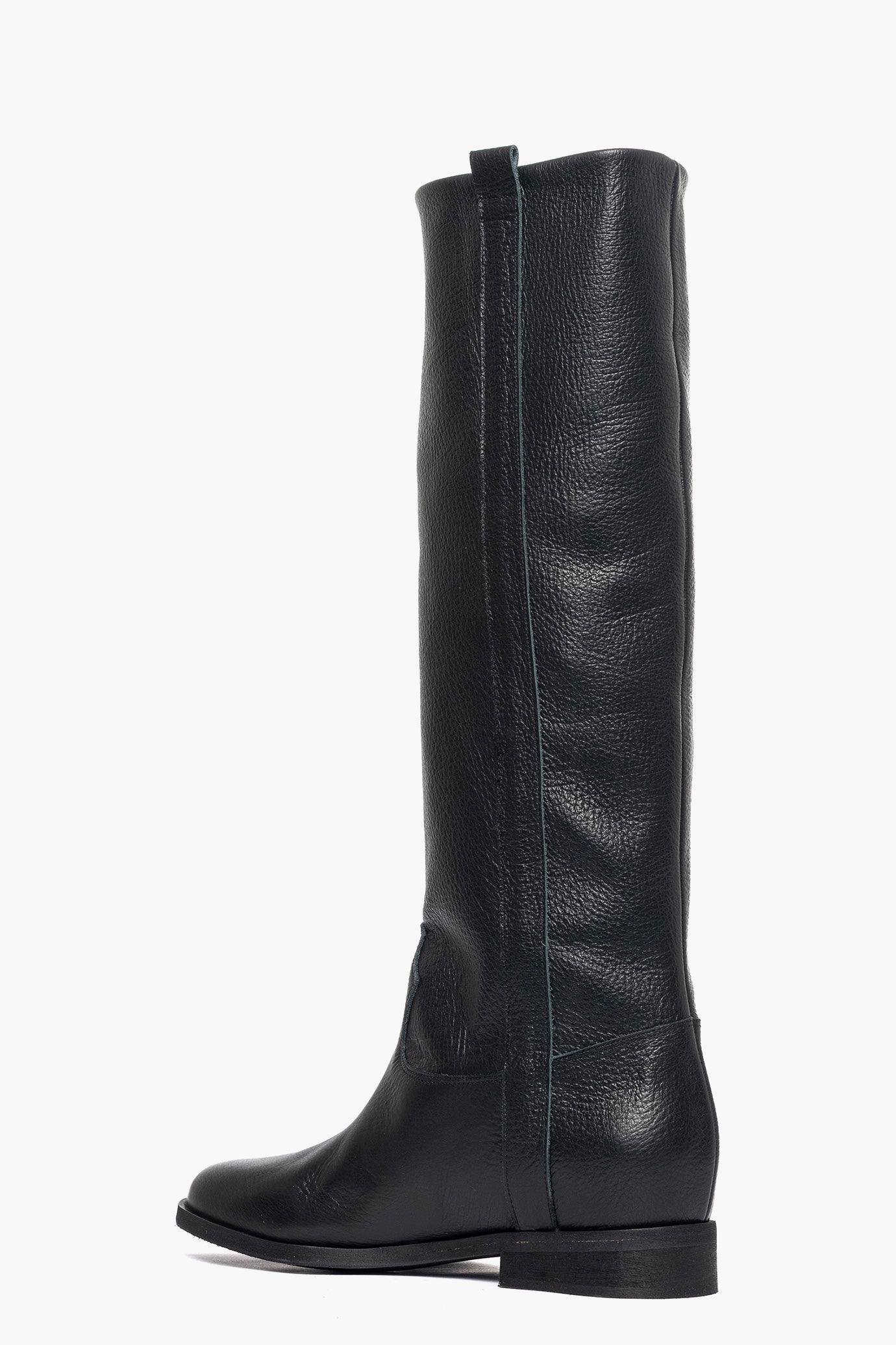 Stivale sotto al ginocchio, in pelle nero con rialzo interno, suola nera in gomma altezza completa 5/6 cm, interni e sottopiede in similpelle, calzano regolari, taglia italiana. Calzature realizzate artigianalmente, rigorosamente made in Italy.