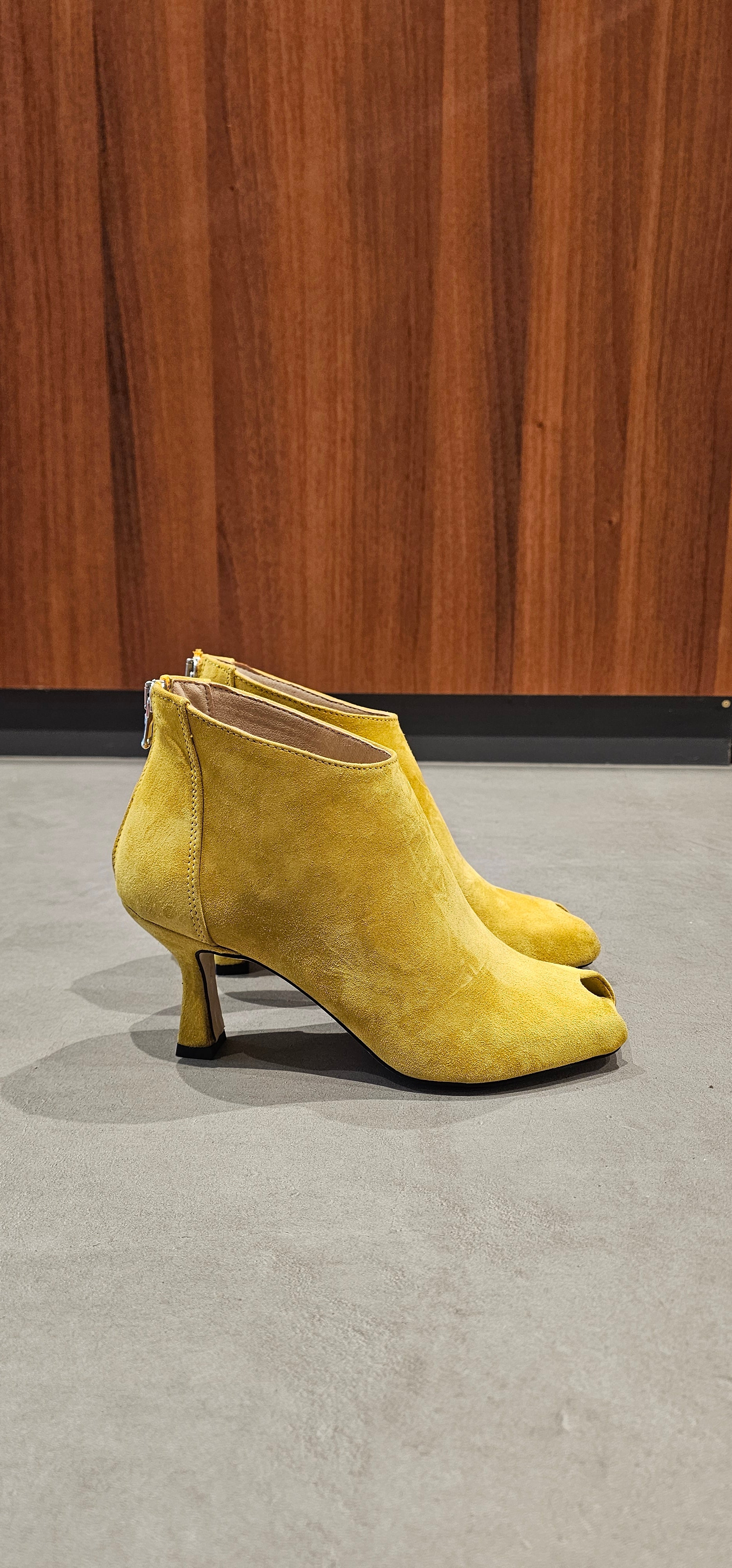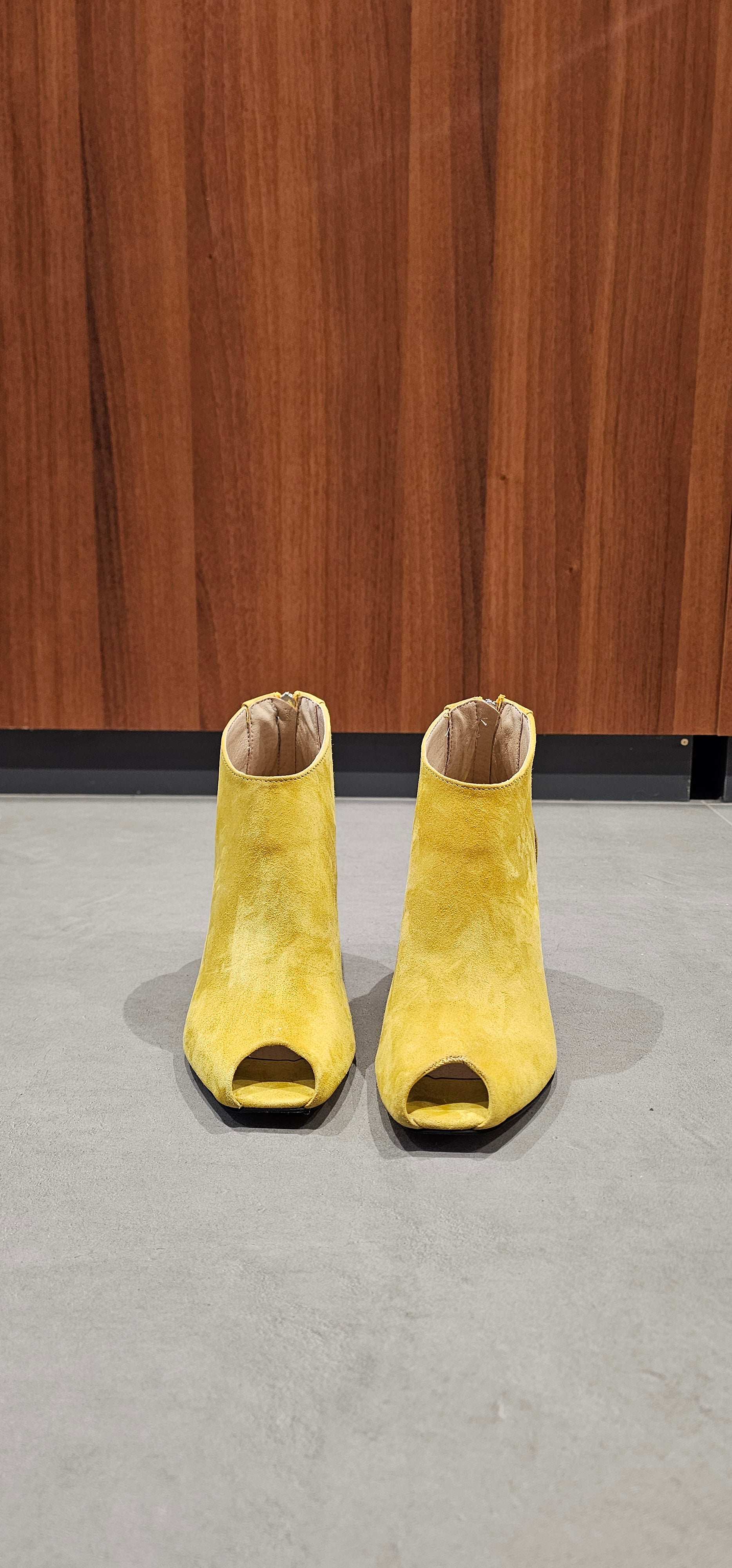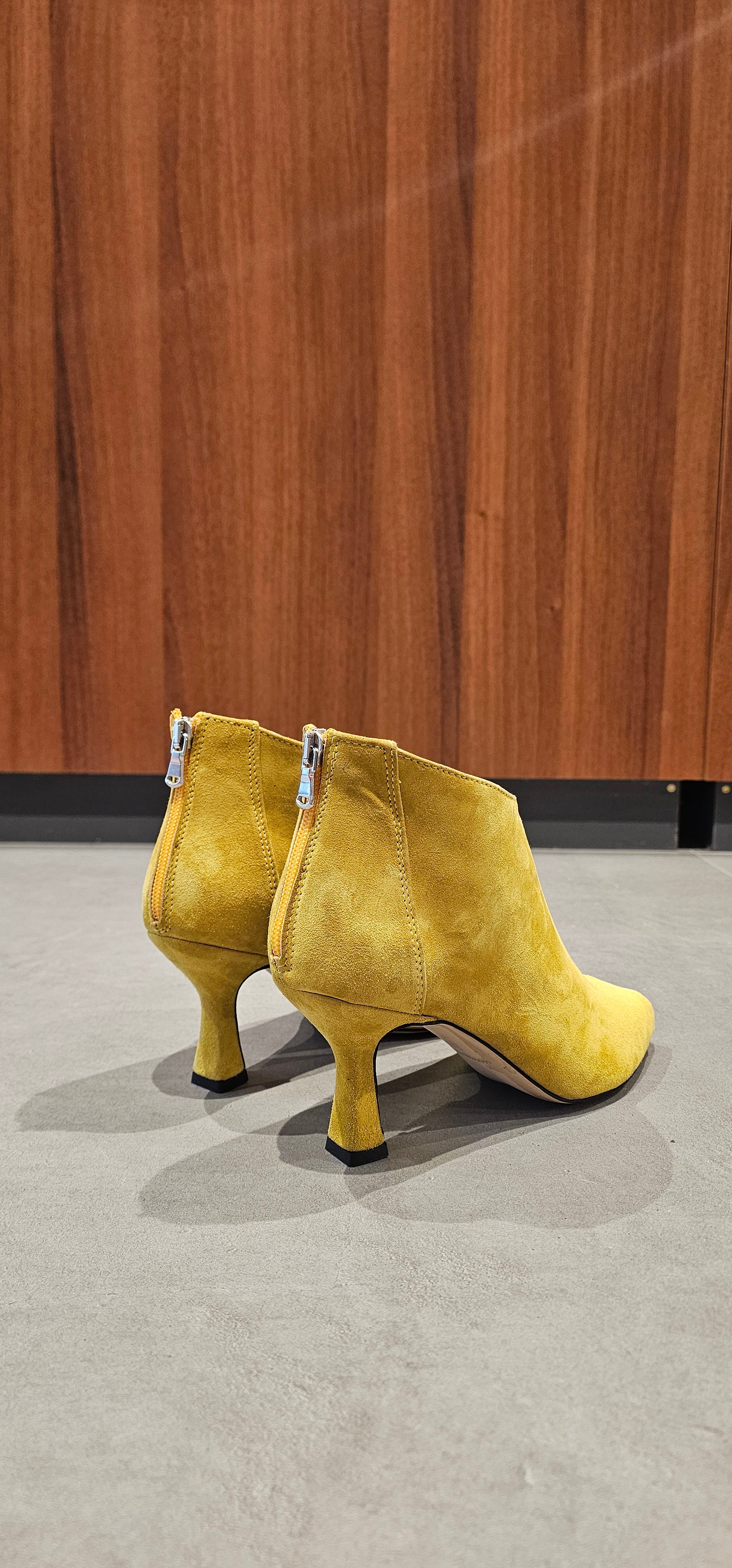 Tronchetti in camoscio giallo spuntato, della linea Love, tacco rivestito, 8.5, interni in similpelle, con zip. Calzano regolari, calzature artigianali, Made in Italy.