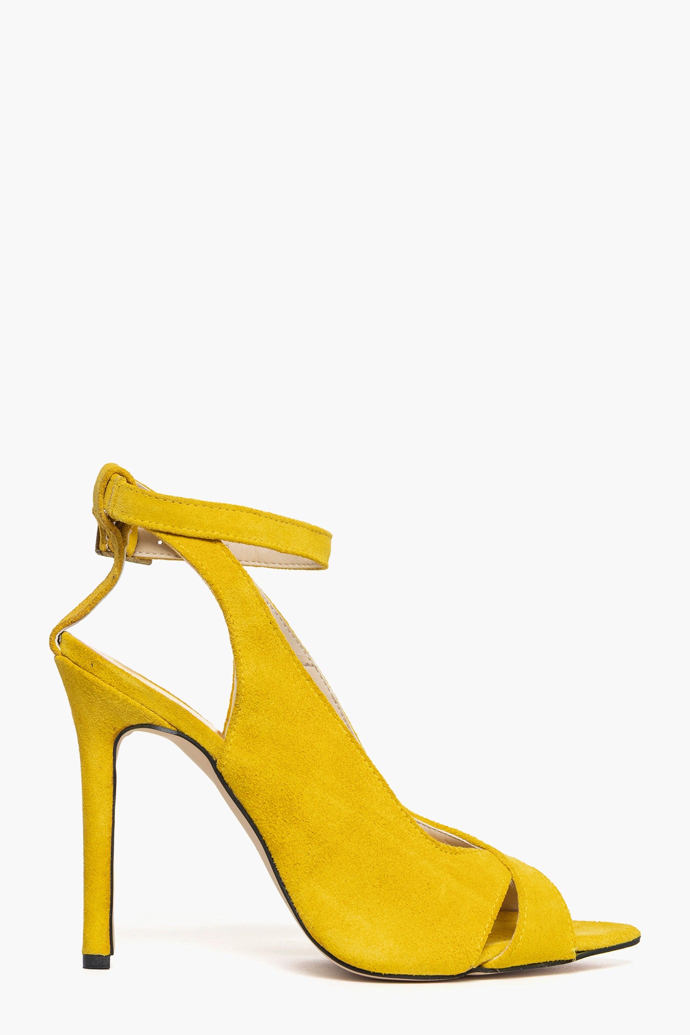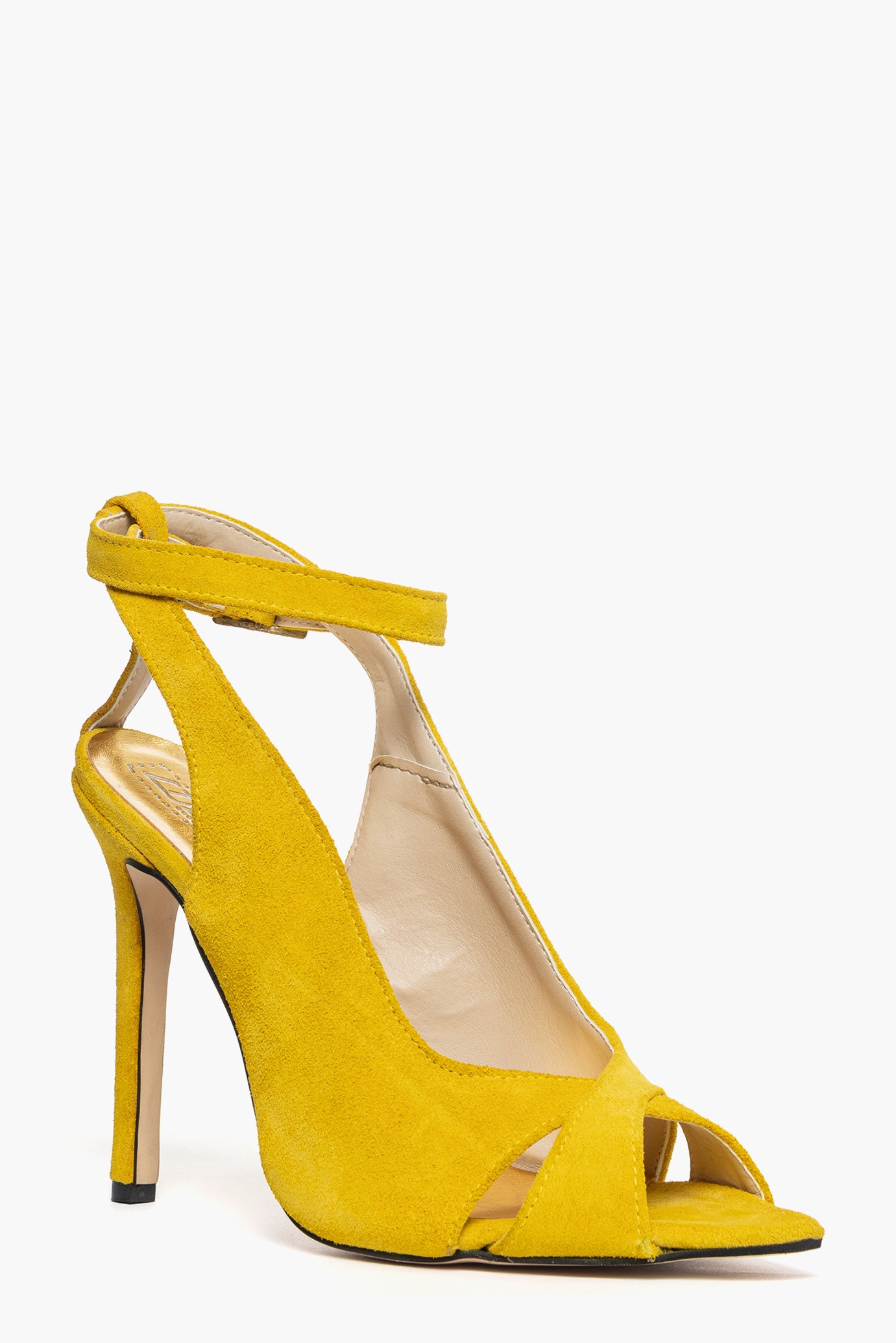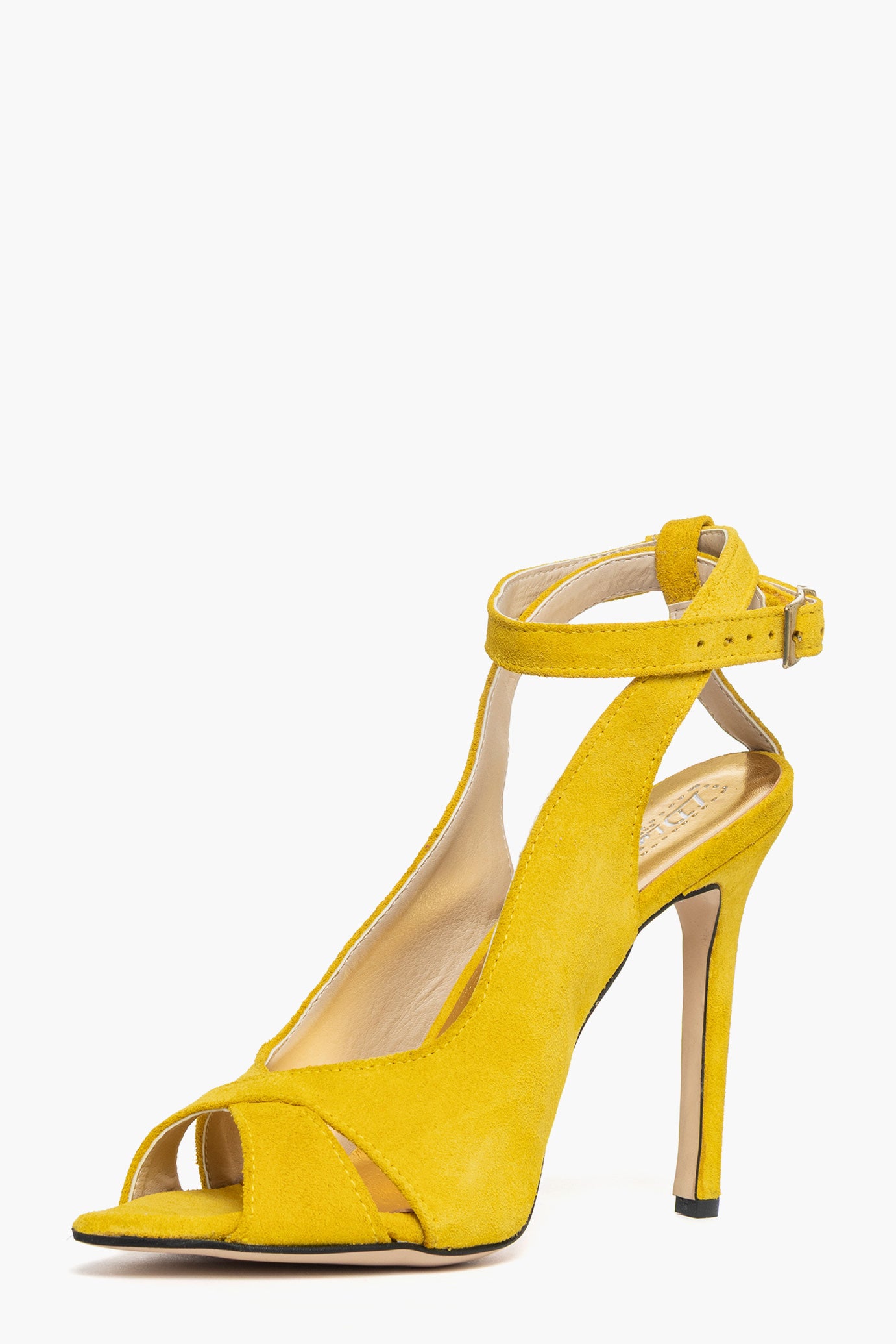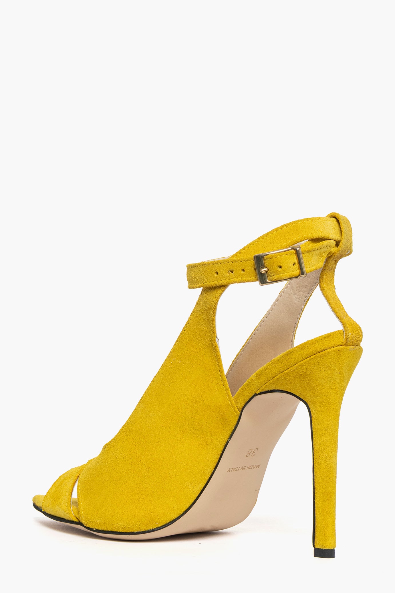 Sandalo in camoscio giallo con cinturino alla caviglia regolabile con fibbietta nel colore argento, tacco rivestito, altezza 11, interni in similpelle. Calzano regolari, punta in avanti. Calzature artigianali, made in Italy.