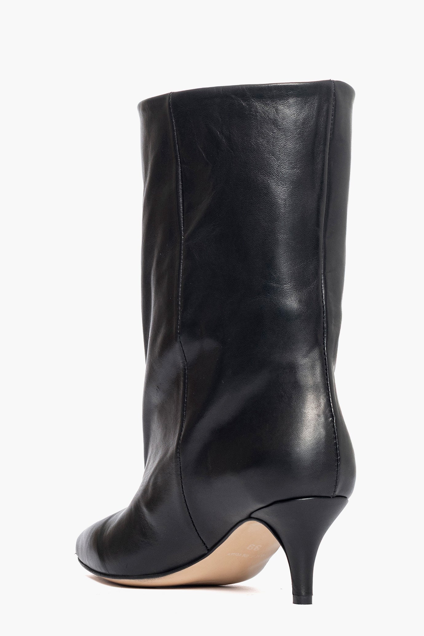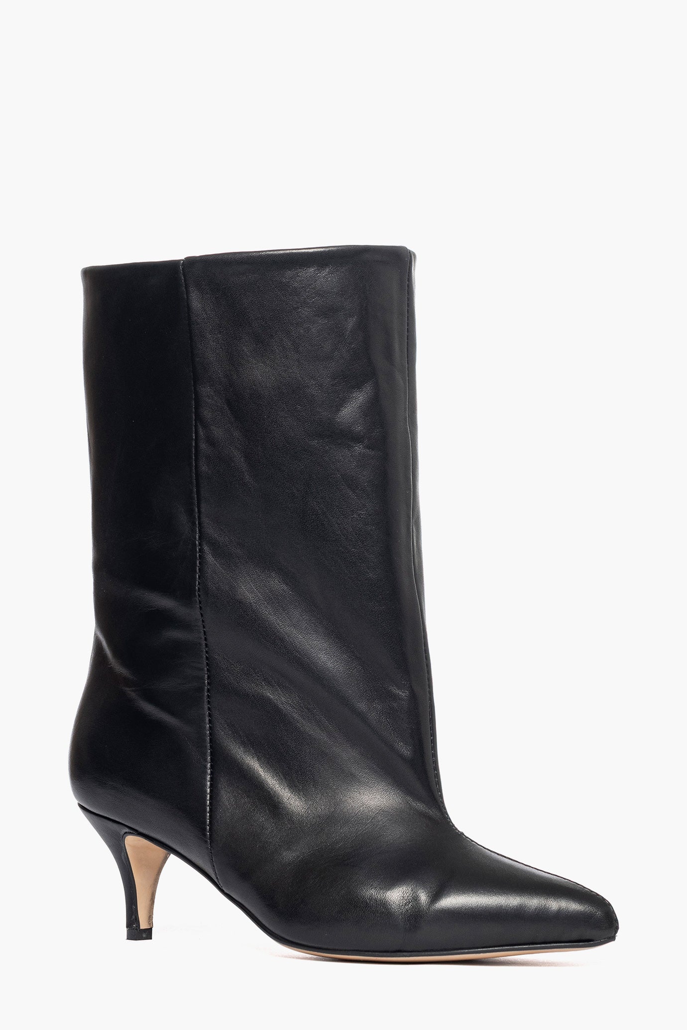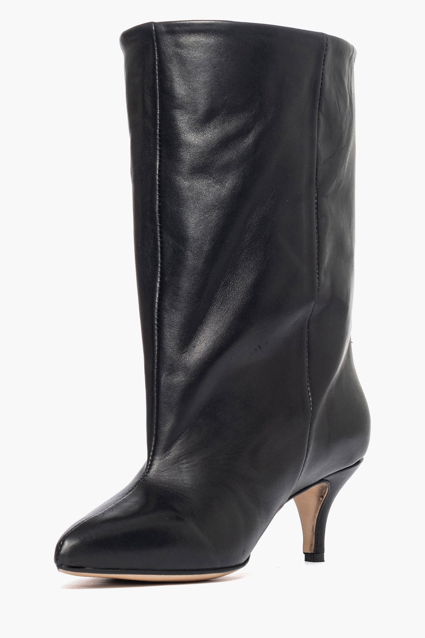 Stivaletti in pelle nero, con gambale ampio, al polpaccio ampiezza 42/43, li rende innovativi e di tendenza, interni in similpelle, tacco rivestito 6. Calzano regolari, punta stretta, privo di cerniera. Calzature artigianali, made in Italy.