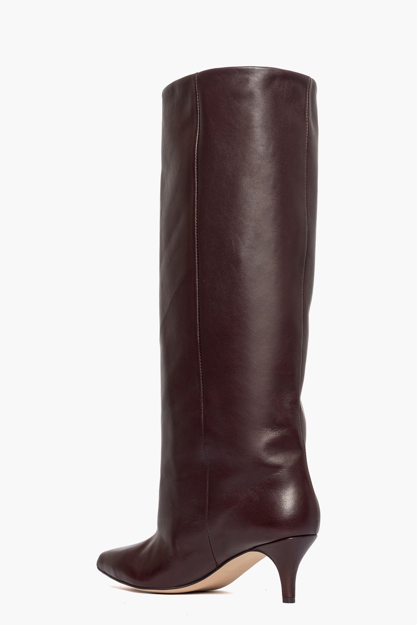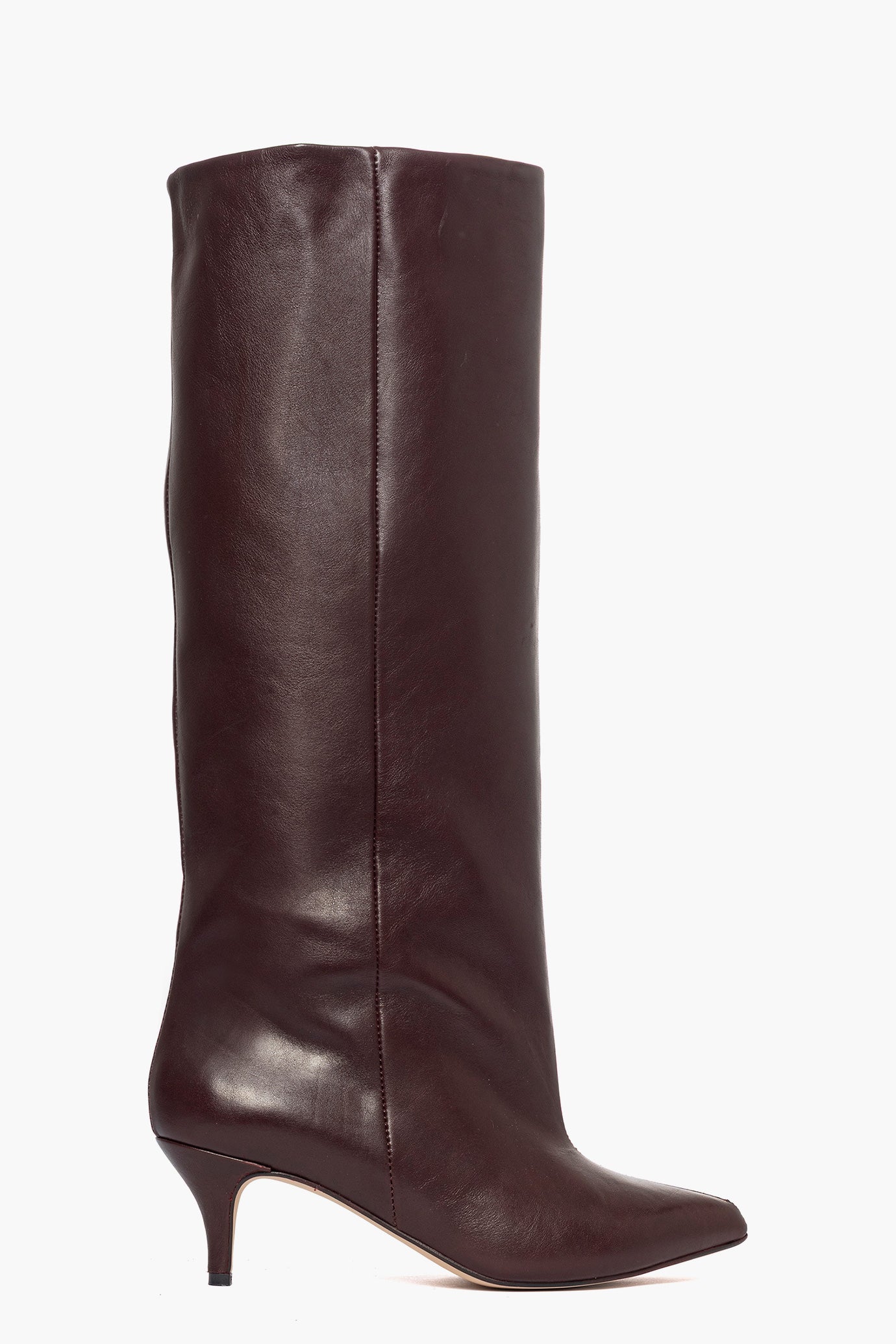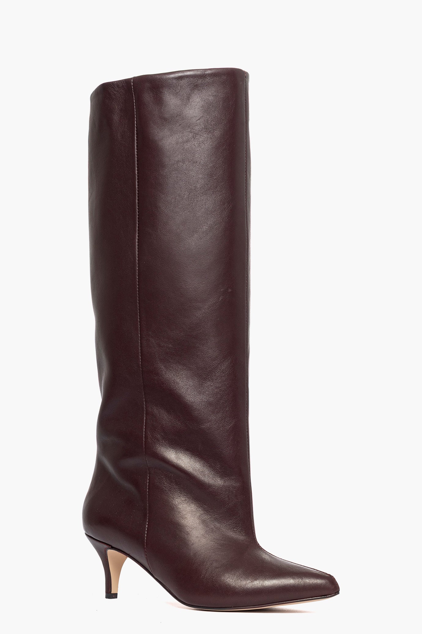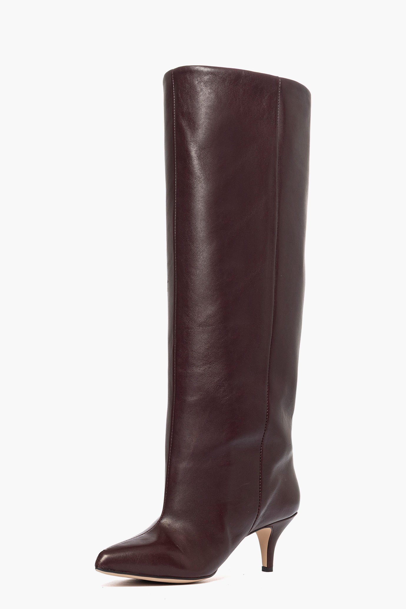 Stivale con gambale ampio circa 46/48 cm in pelle borgogna privo di cerniera, interni i similpelle, tacco rivestito, altezza 6. Calzano giusti, punta stretta. Calzature artigianali, made in Italy.