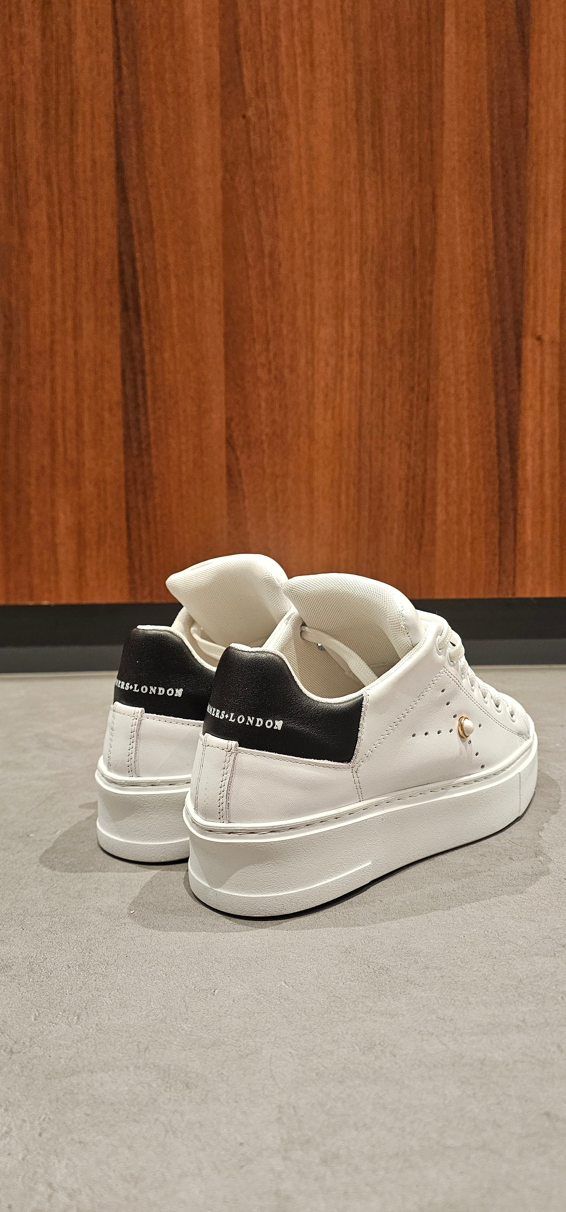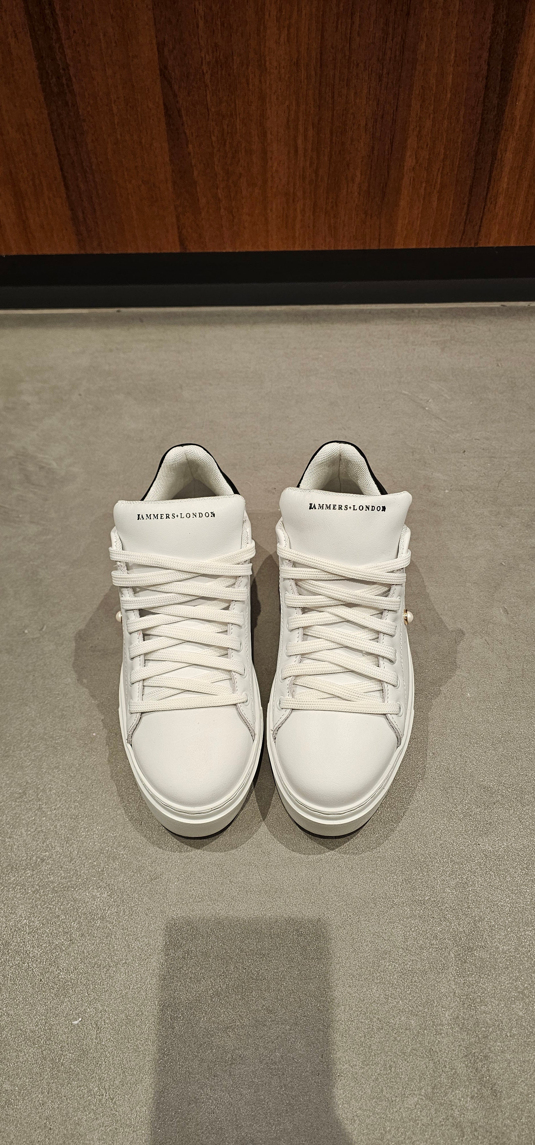 Sneakers in pelle bianco con riporto in pelle nero, a lato una perlina bianca, interni in spugna bianca, lacci ed occhielli bianchi, suola in gomma 4cm, leggerissima bianca, calzano regolari, punta tonda, stampa sulla linguetta e sul retro jammers london. Calzature artigianali, made in Italy.