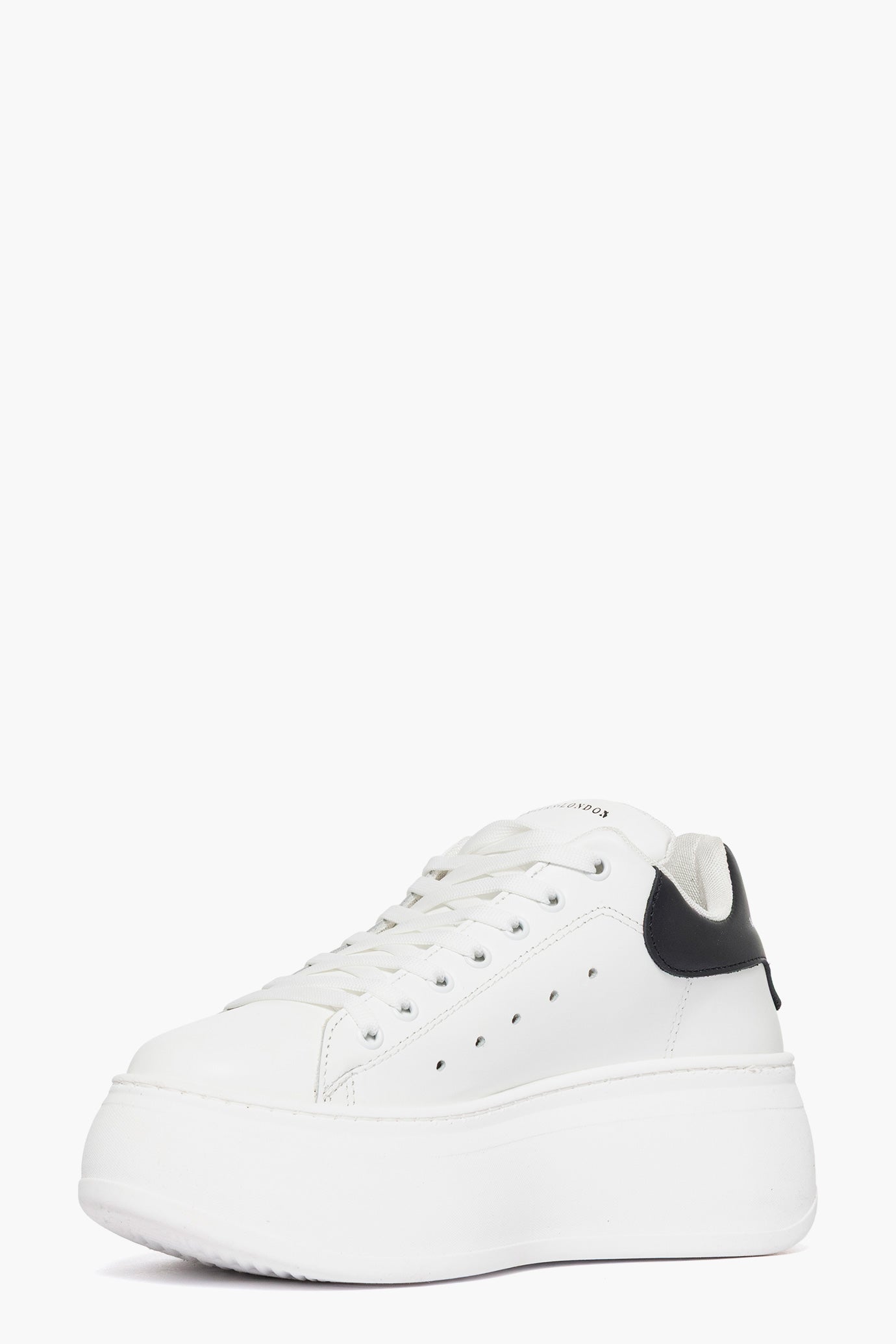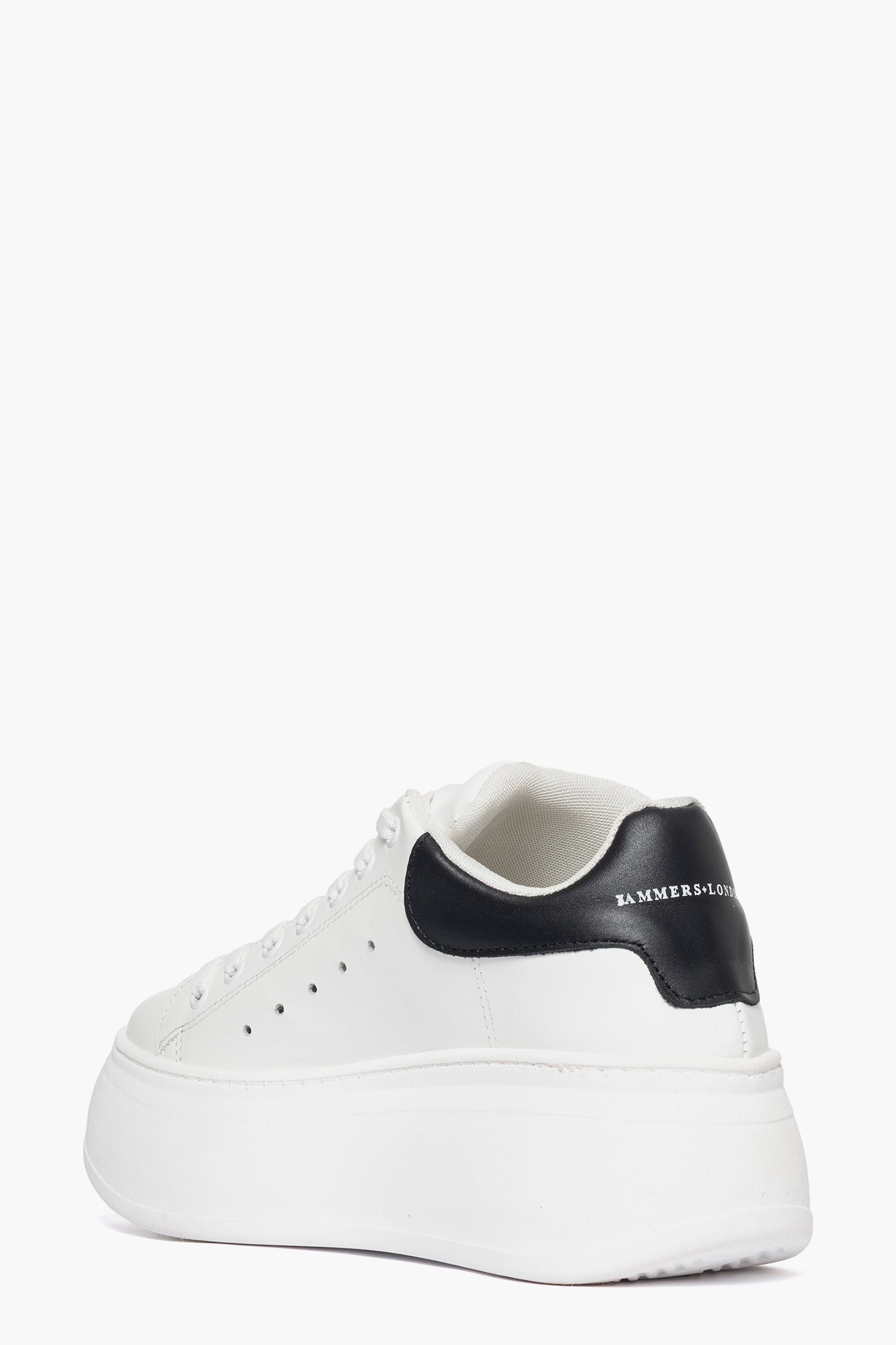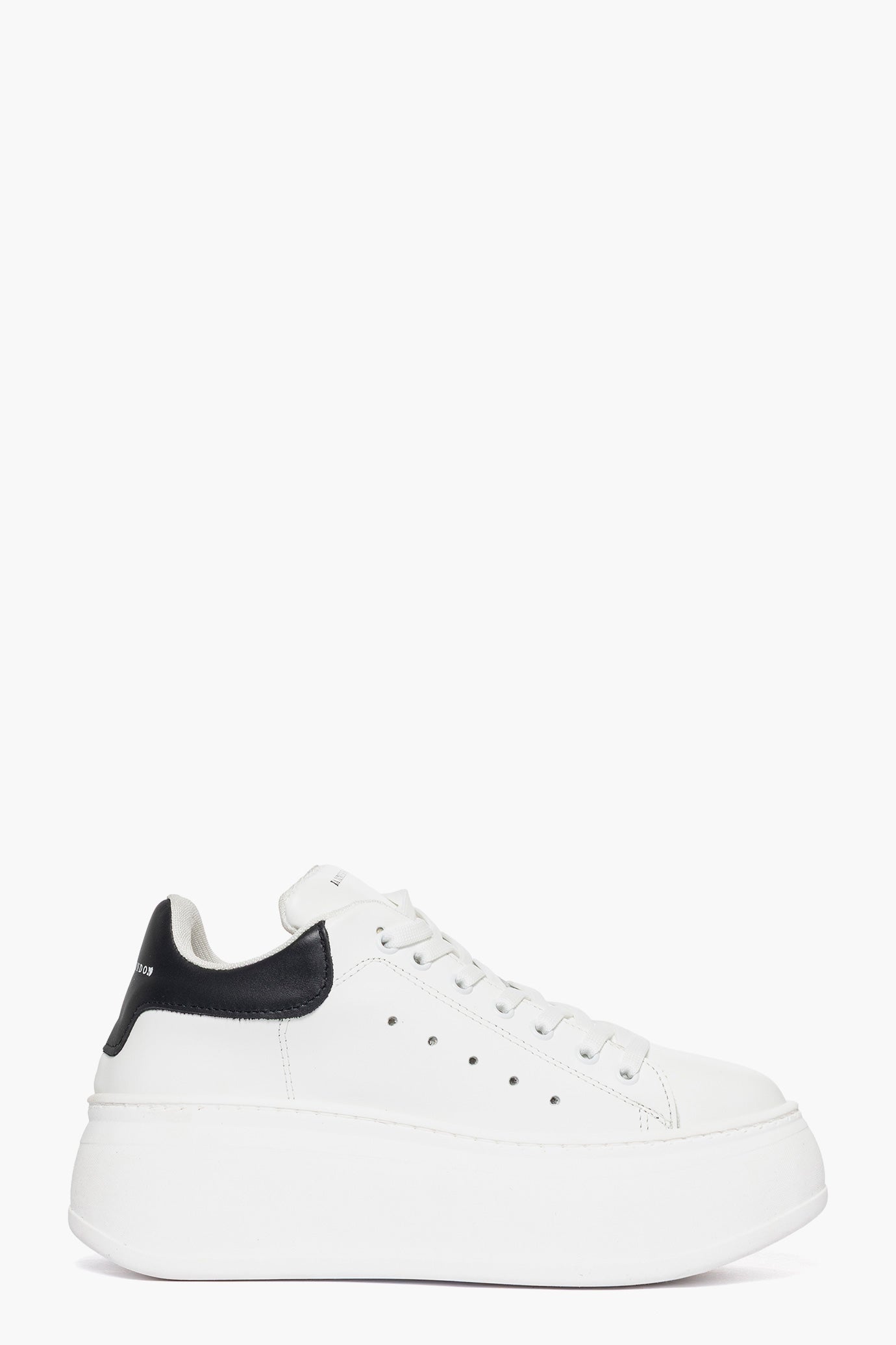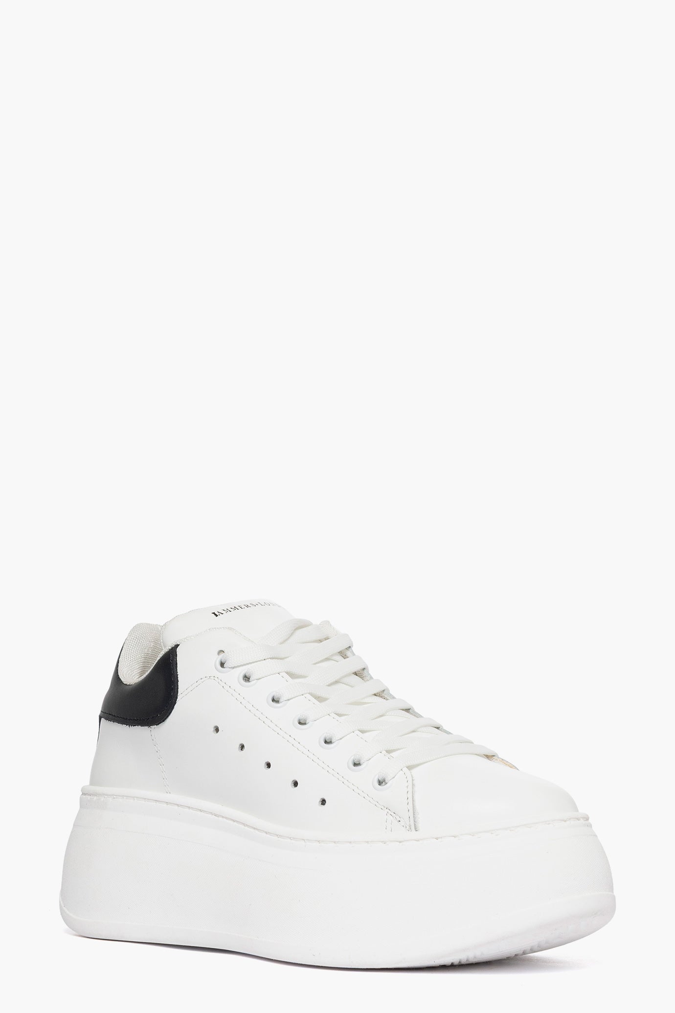 Zapatillas deportivas de piel blanca y aplicación de piel negra, interior de esponja blanca y plantilla suave, suela ancha, ojales y cordones blancos, suela de goma blanca, altura 6. Lia Diva, calzan cómodamente, así que no cojas talla extra a quién. tiene medio número, pero un número menos. Calzado artesanal, rigurosamente fabricado en Italia.