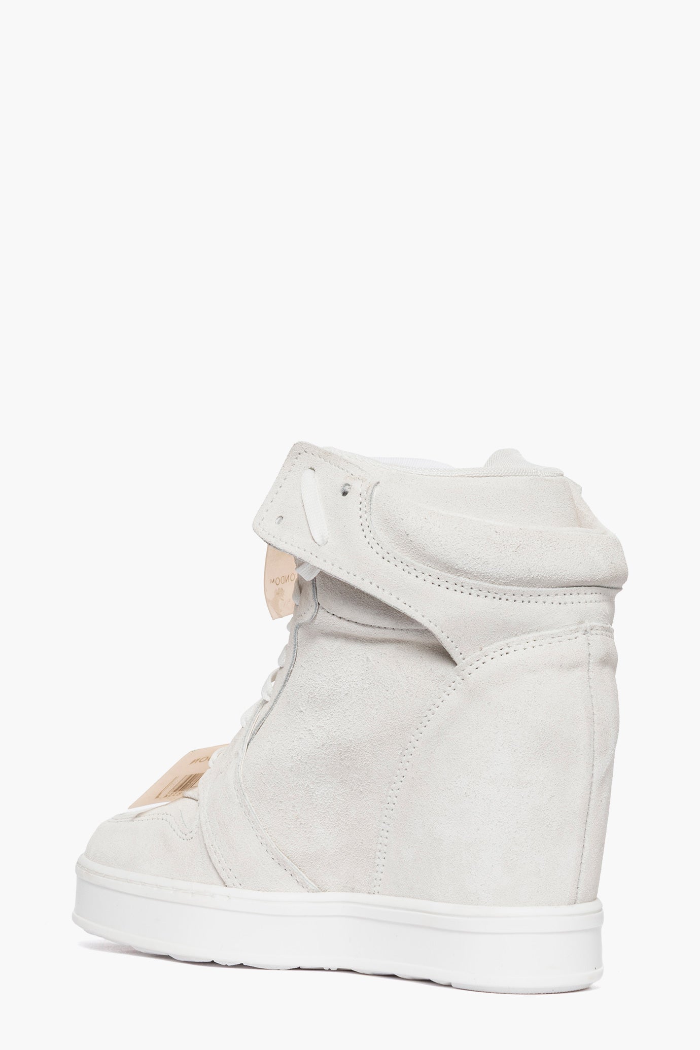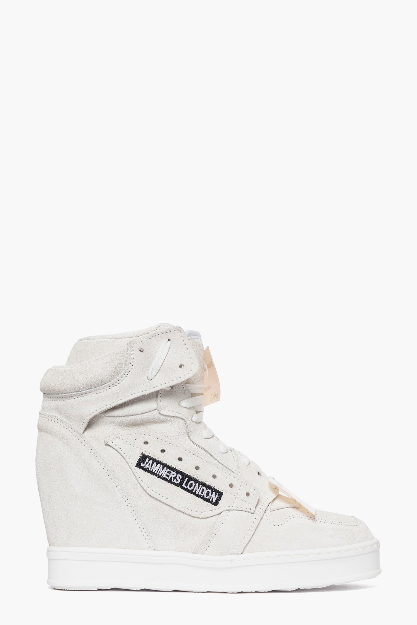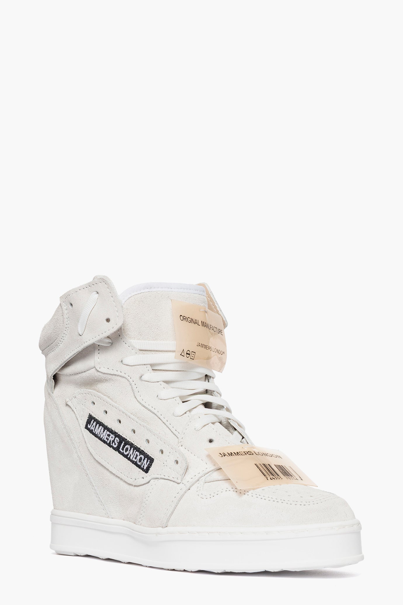 Deportivas en versión 2, en ante hielo con estampado Jammers London negro, etiqueta de PVC nude y estampado negro, cuña interna de 10 cm de altura, cordones blancos, forro de esponja blanca, suela de goma blanca. Calzado artesanal, rigurosamente fabricado en Italia.