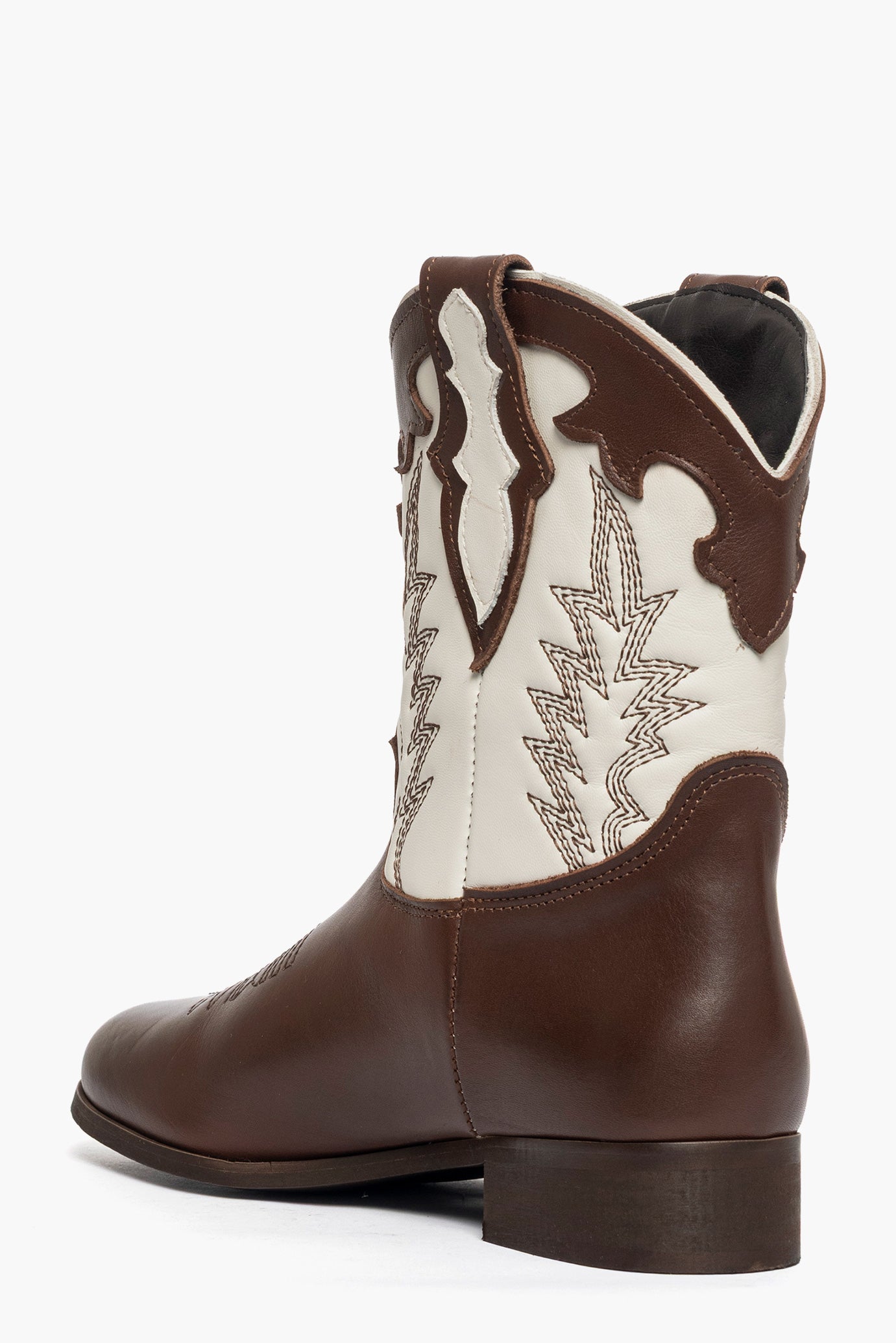 Stivaletti pelle marrone e pelle beige con ricamo a contrasto, interni in similpelle, suola spazzolata marrone, 3. Calzano regolari, punta tonda. Calzature artigianali, made in Italy.