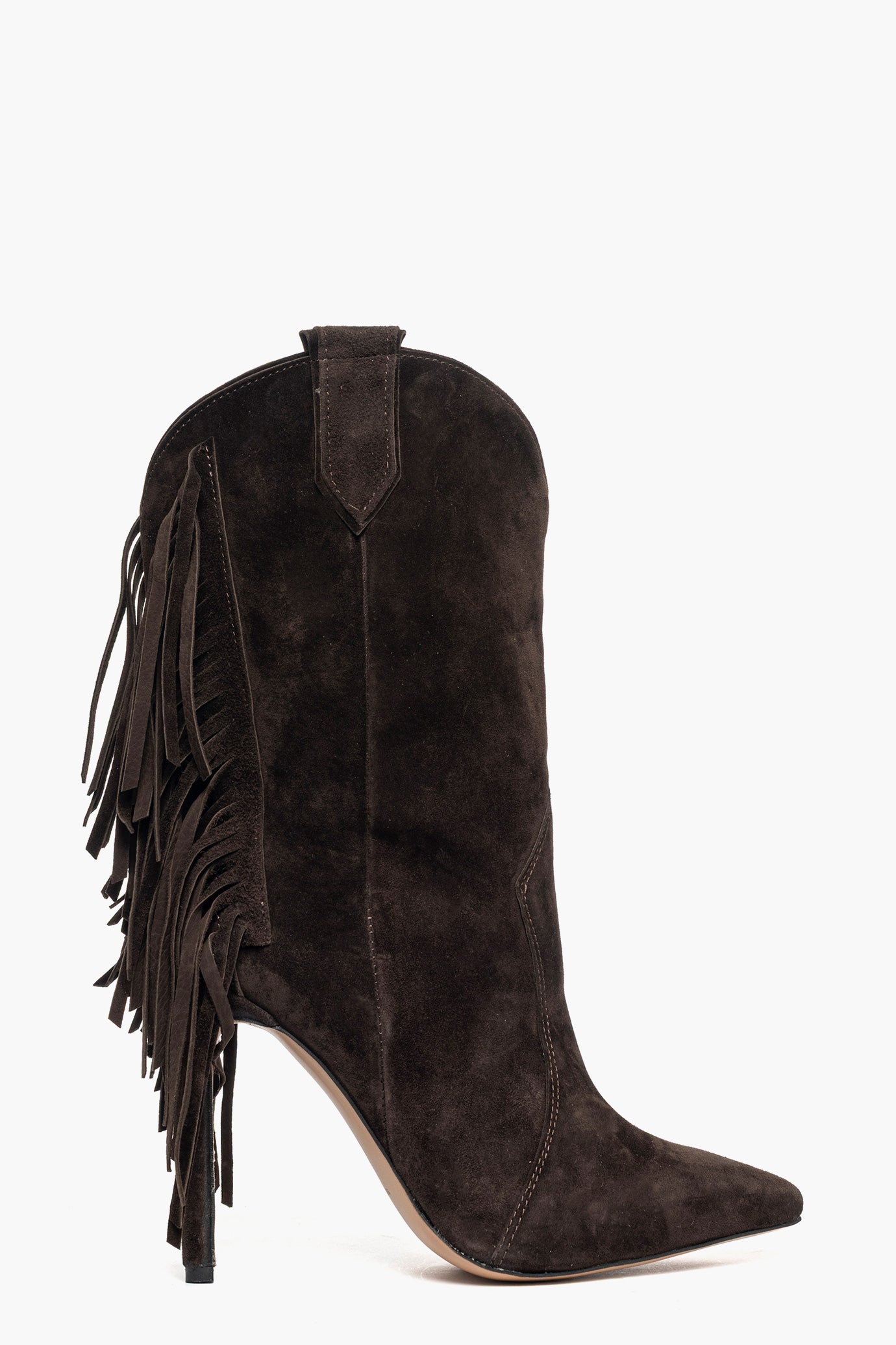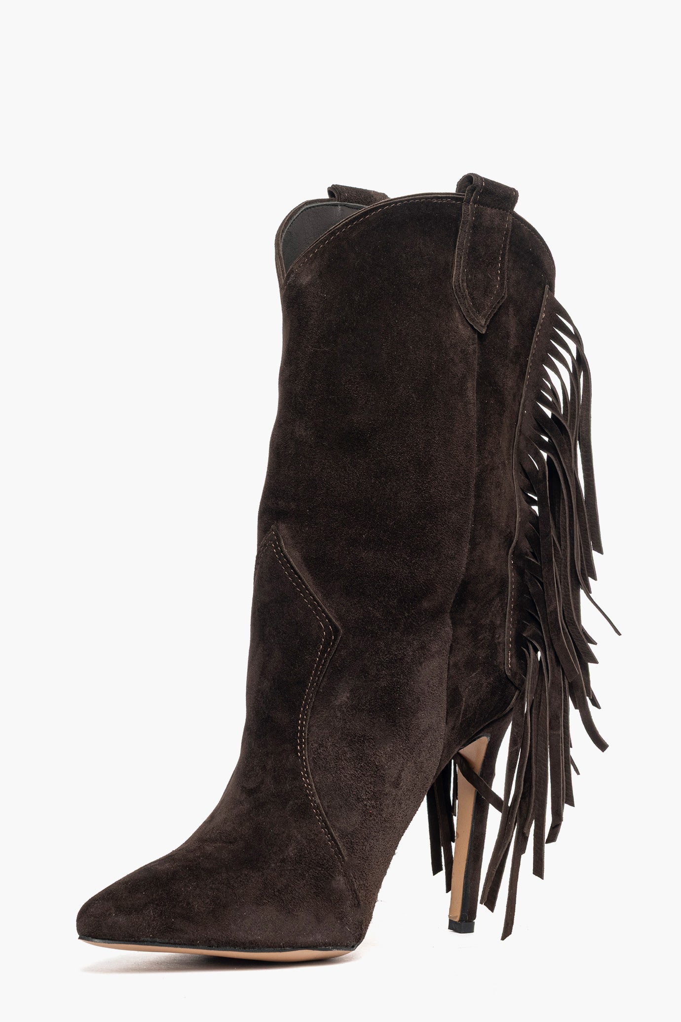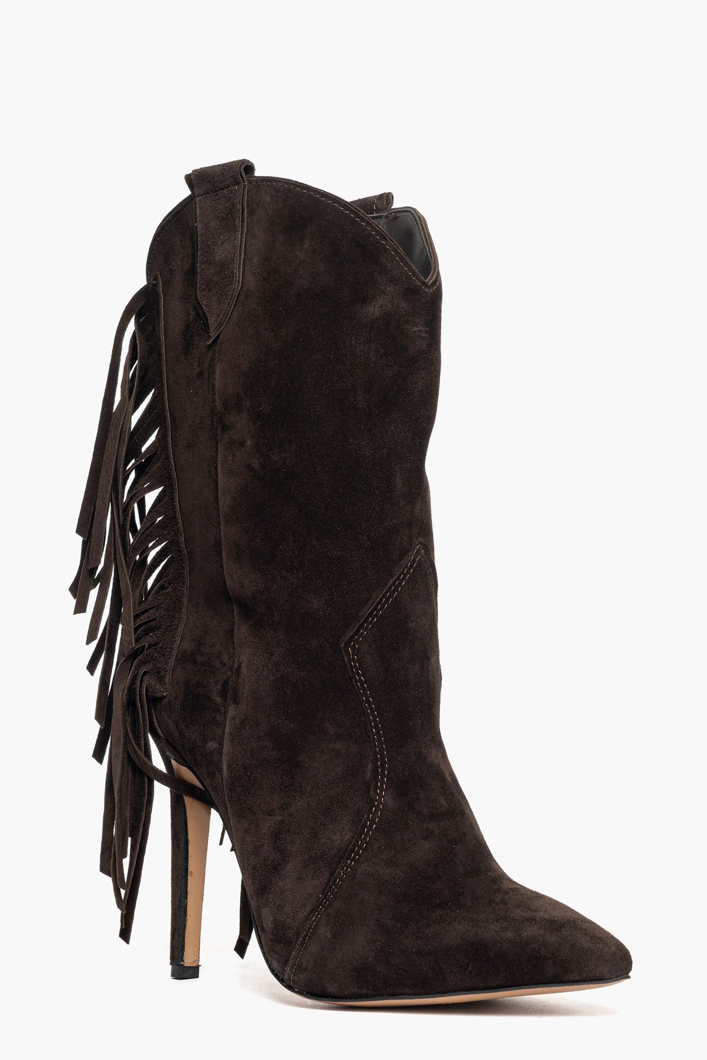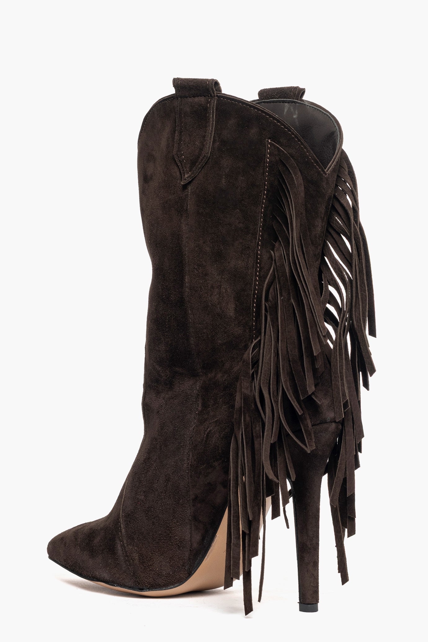 Stivaletti camoscio cioccolato sotto al polpaccio con frange, tacco a spillo rivestito, altezza 11, interni in similpelle, punta stretta, calzano regolari. Calzature artigianali, made in Italy.