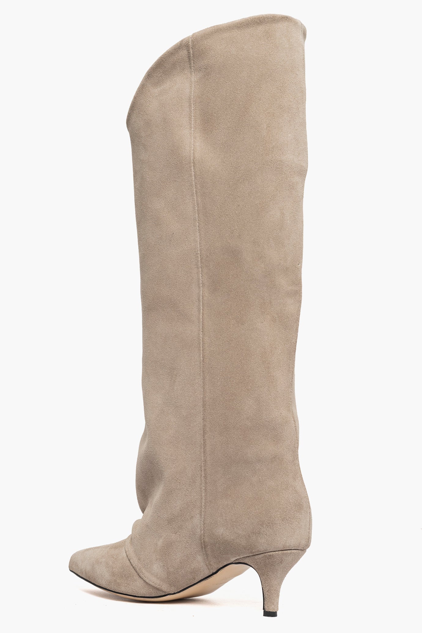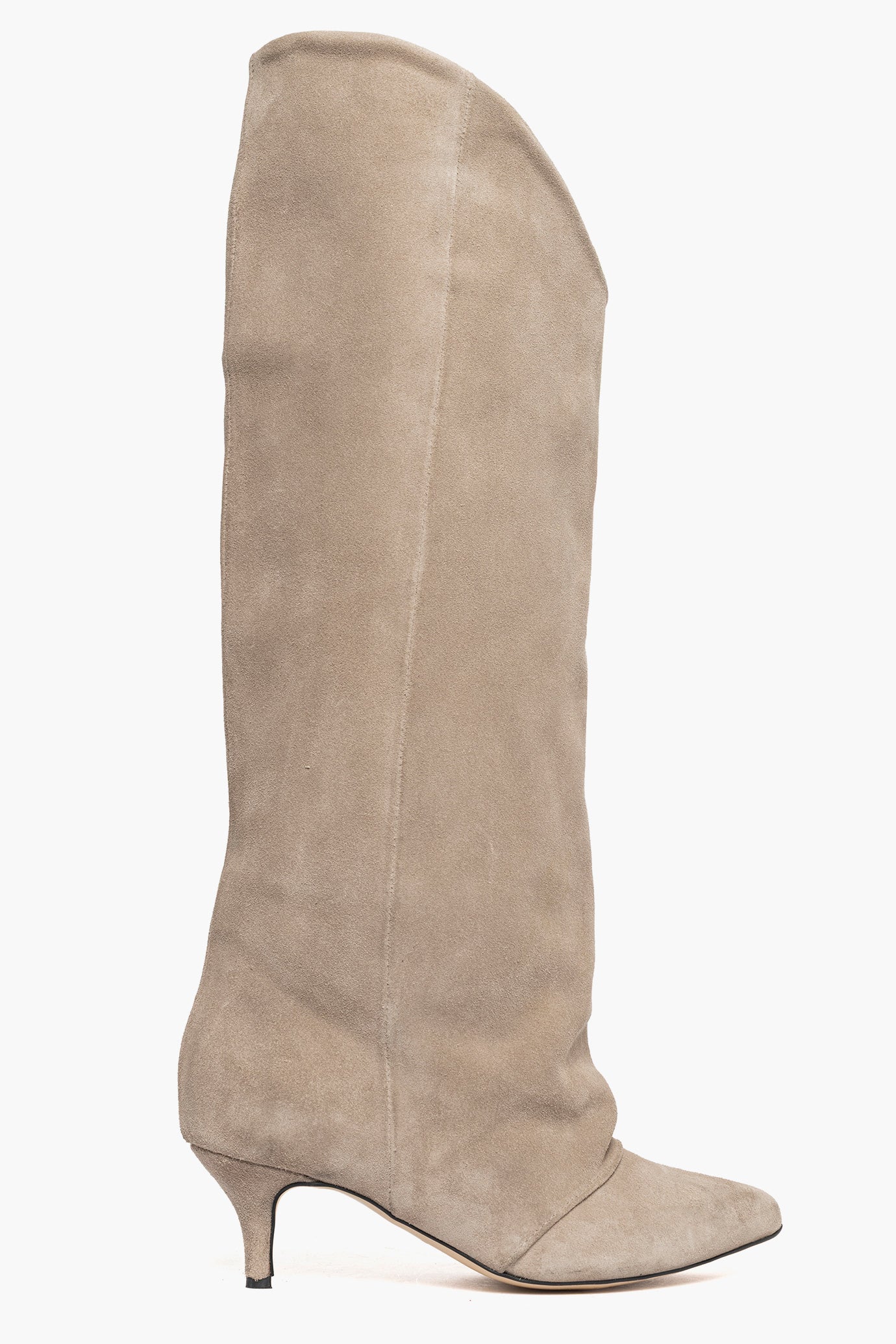 Stivale in camoscio taupè, interni in similpelle, tacco rivestito, 6, calzano regolari, punta in avanti, la versione alta della linea Angel, calzature artigianali, made in Italy.