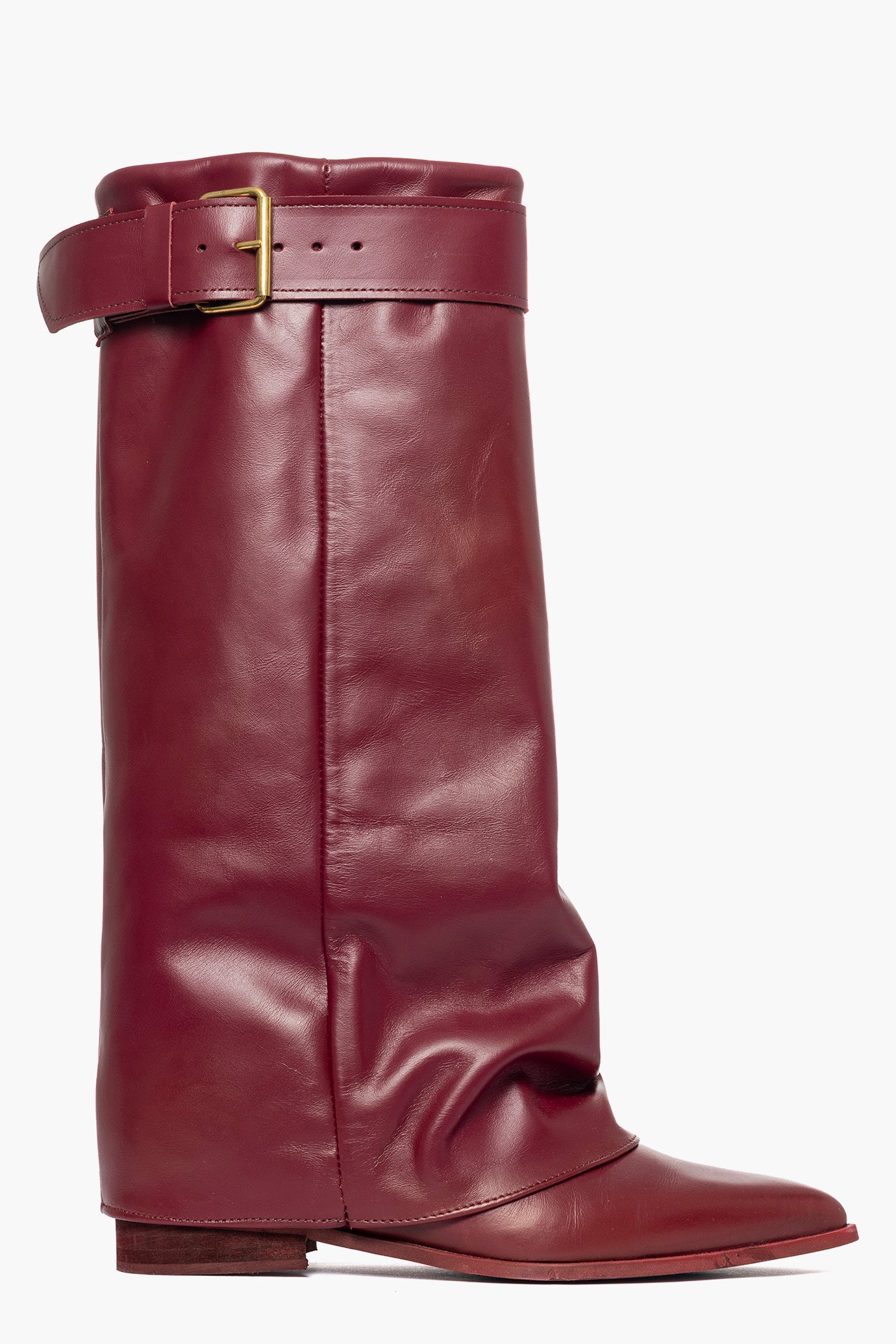 Stivale in pelle bordeaux con risvolto e rialzo interno, con cintura e fibbia nel colore oro, altezza totale 7,punta stretta, interni in similpelle. Calzano giusti. Calzature artigianali, made in Italy.