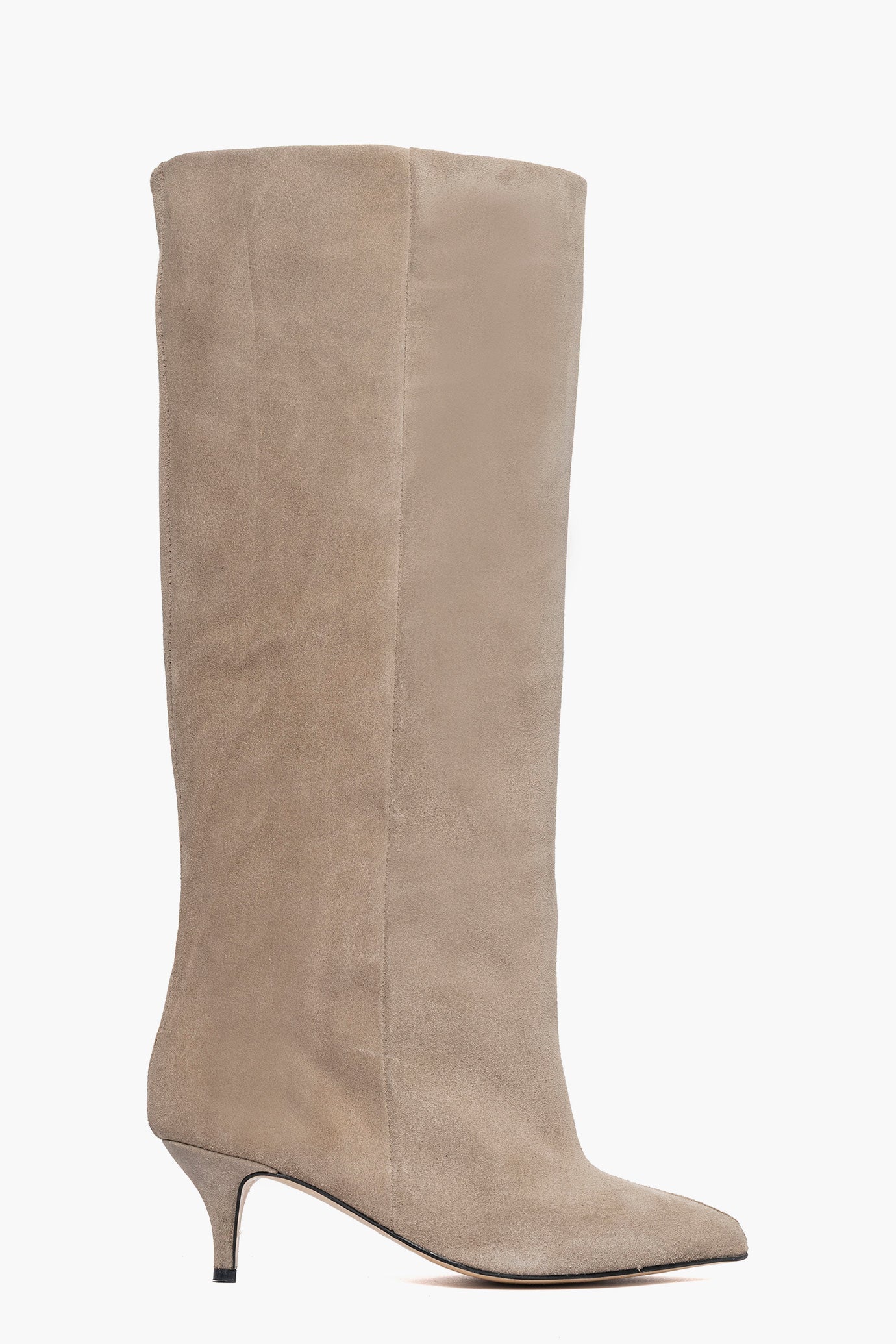 Stivale con gambale ampio circa 46/48 cm in camoscio taupè, privo di cerniera, interni i similpelle, tacco rivestito, altezza 6. Calzano giusti, punta stretta. Calzature artigianali, made in Italy.