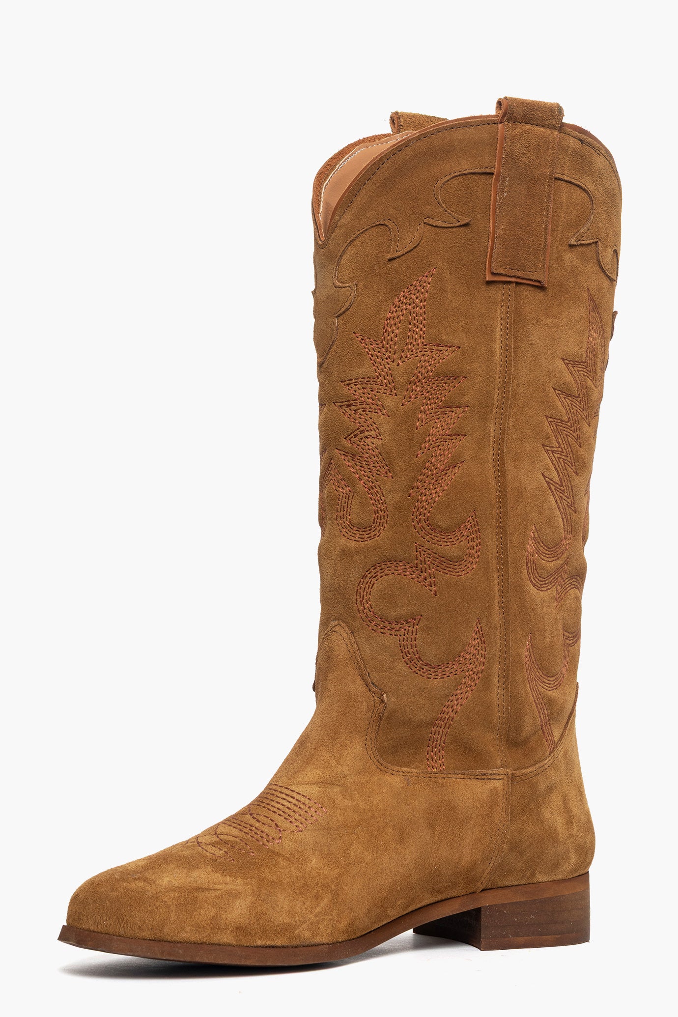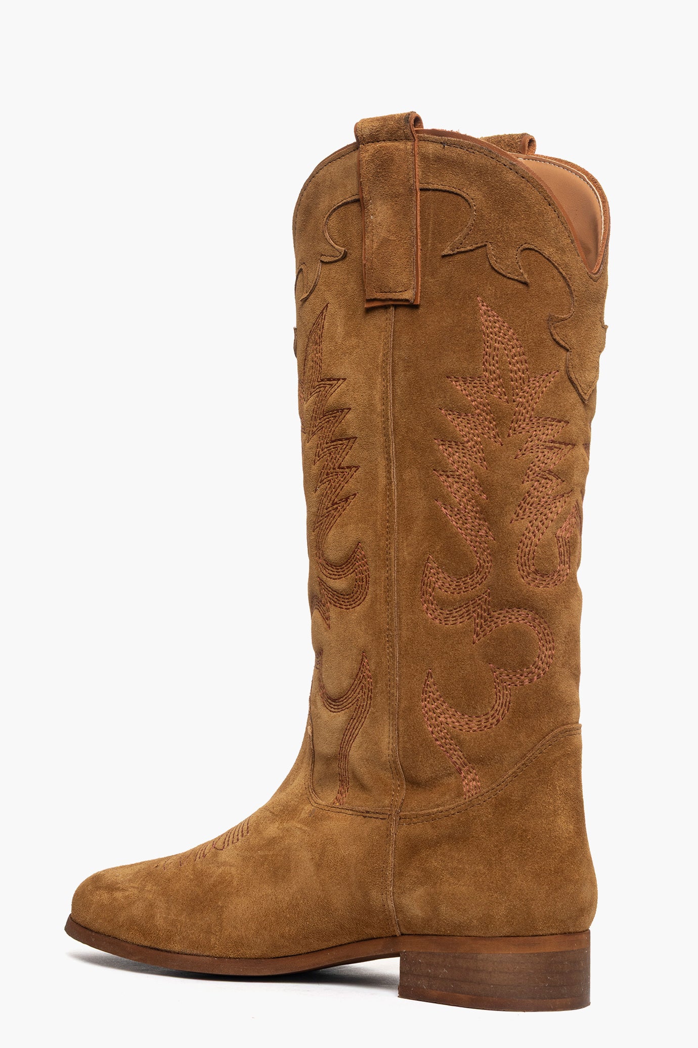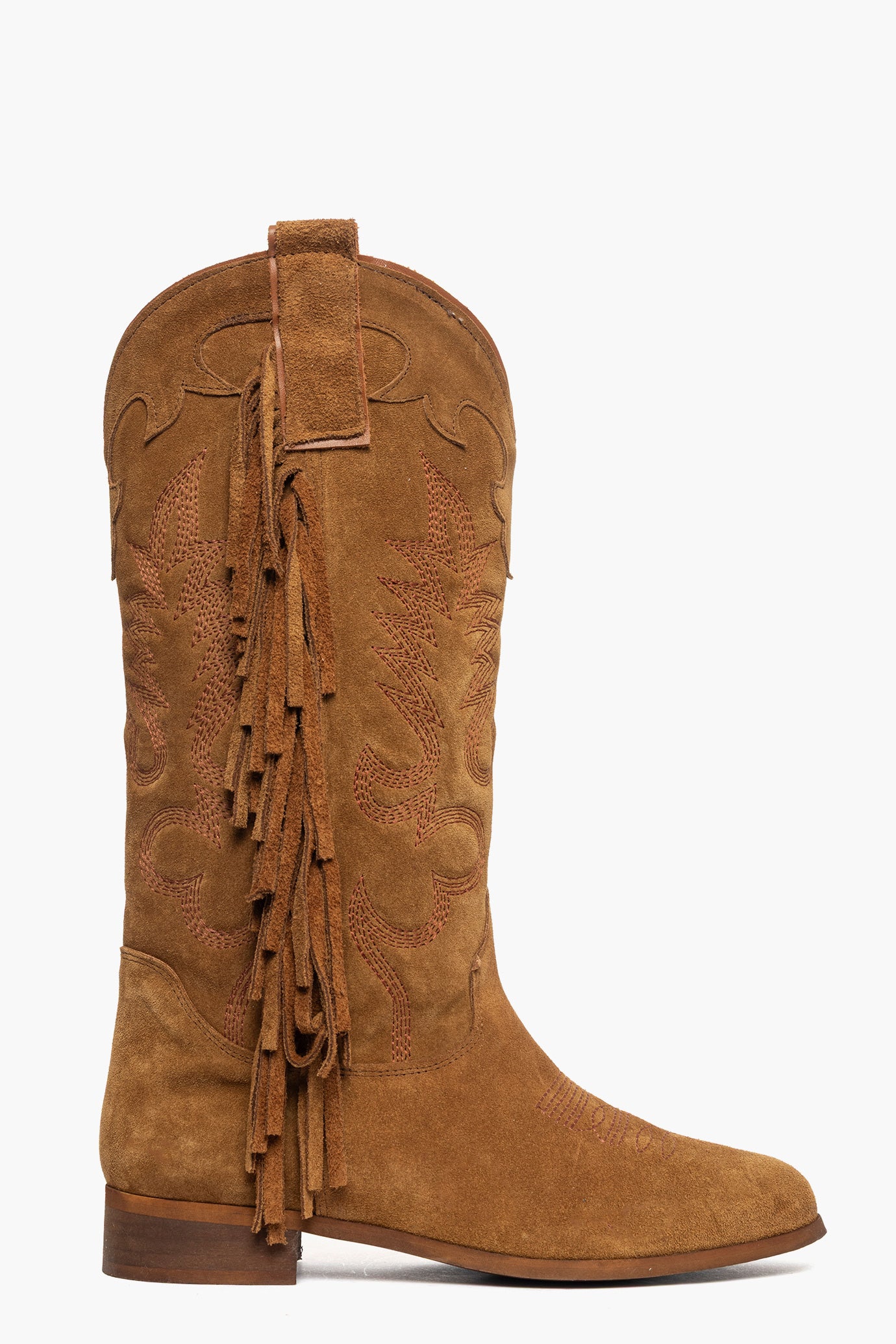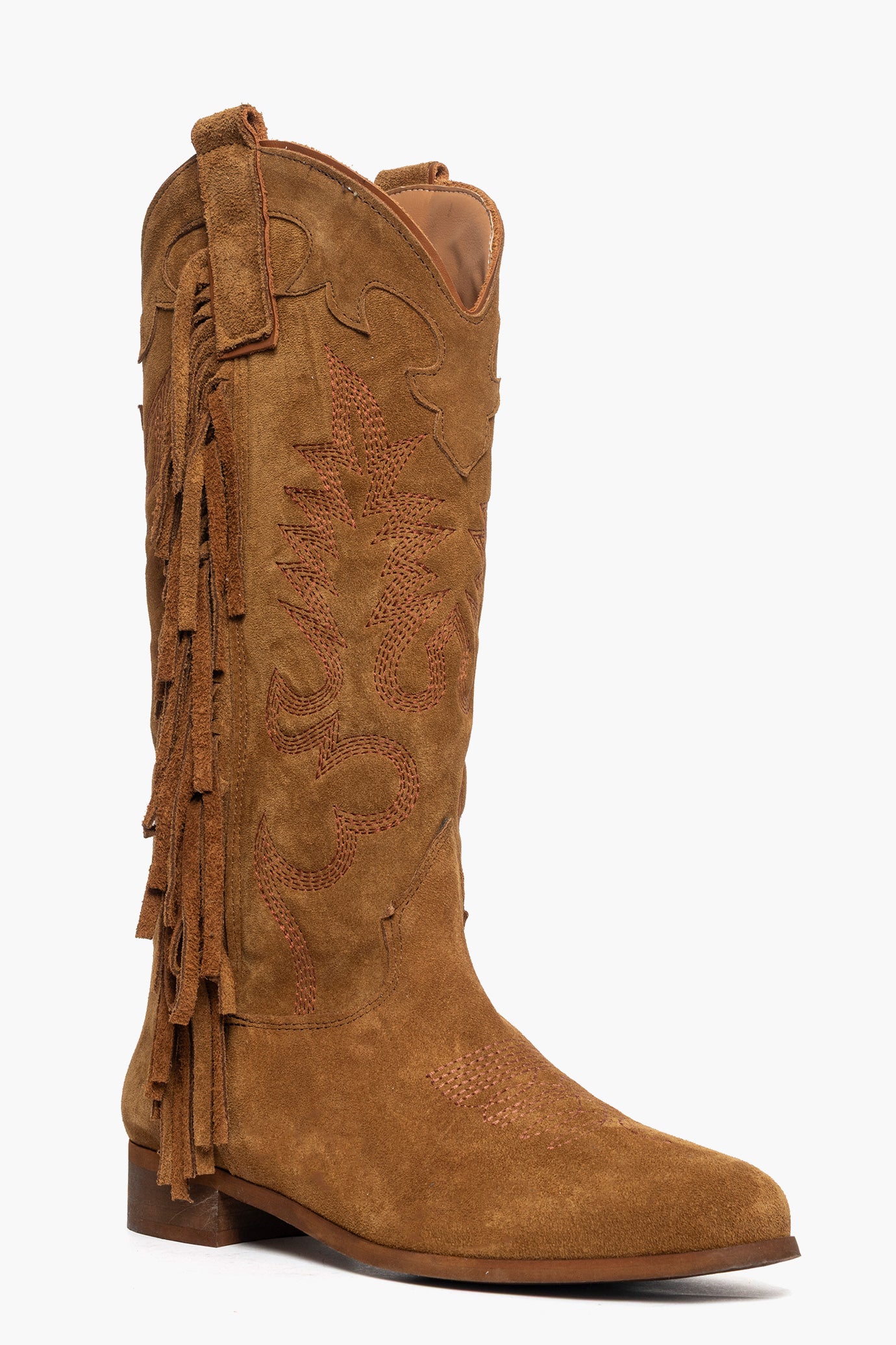 Stivale in camoscio cuoio con frange e particolare ricamo lungo il gambale e in punta, interni in similpelle, privo di cerniera, punta tonda, forma tecsana, suola nel colore neutro spazzolato, altezza 3. Calzano regolari, calzature artigianali, made in Italy