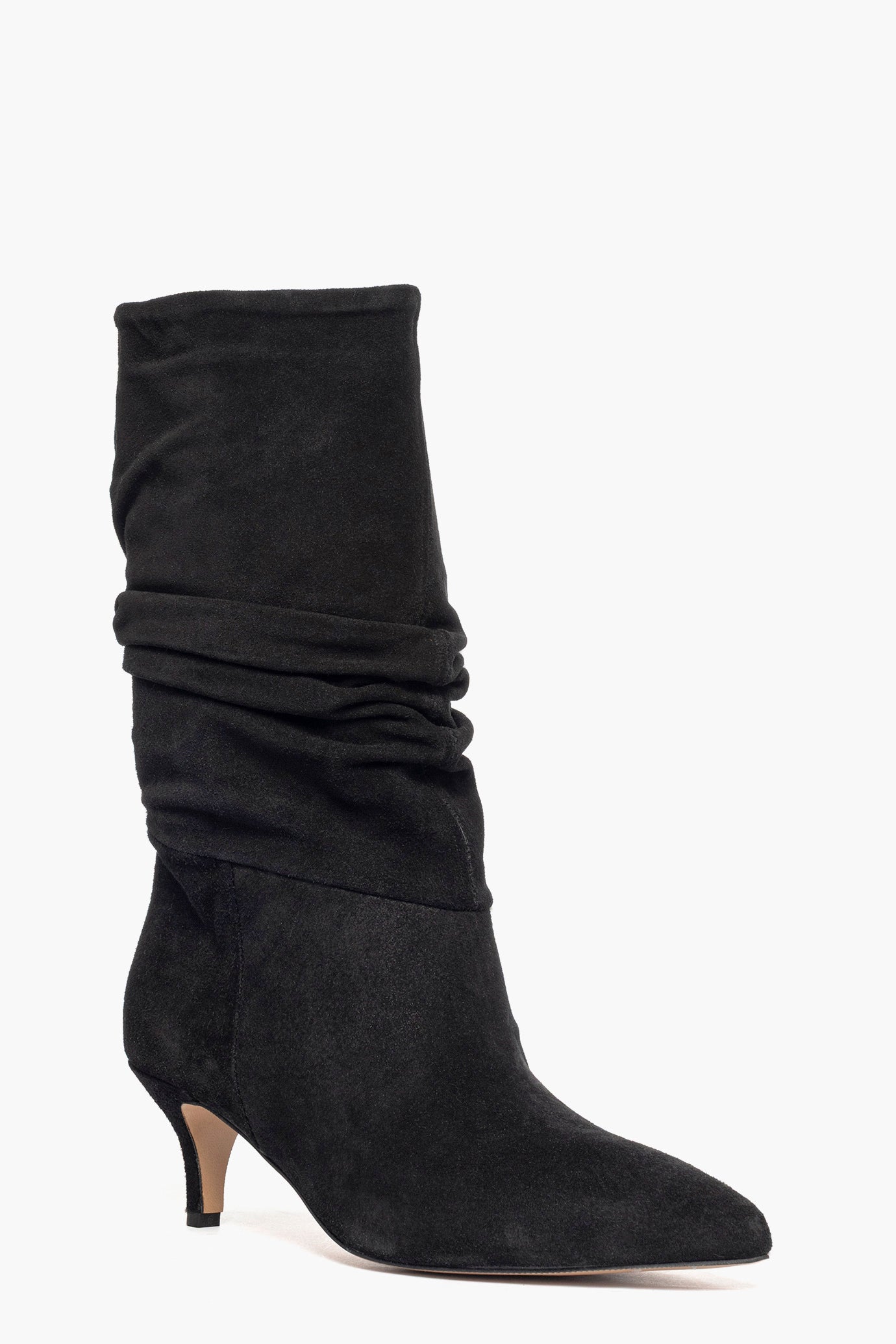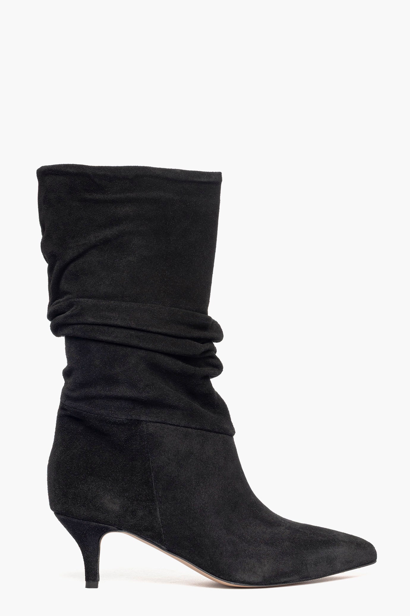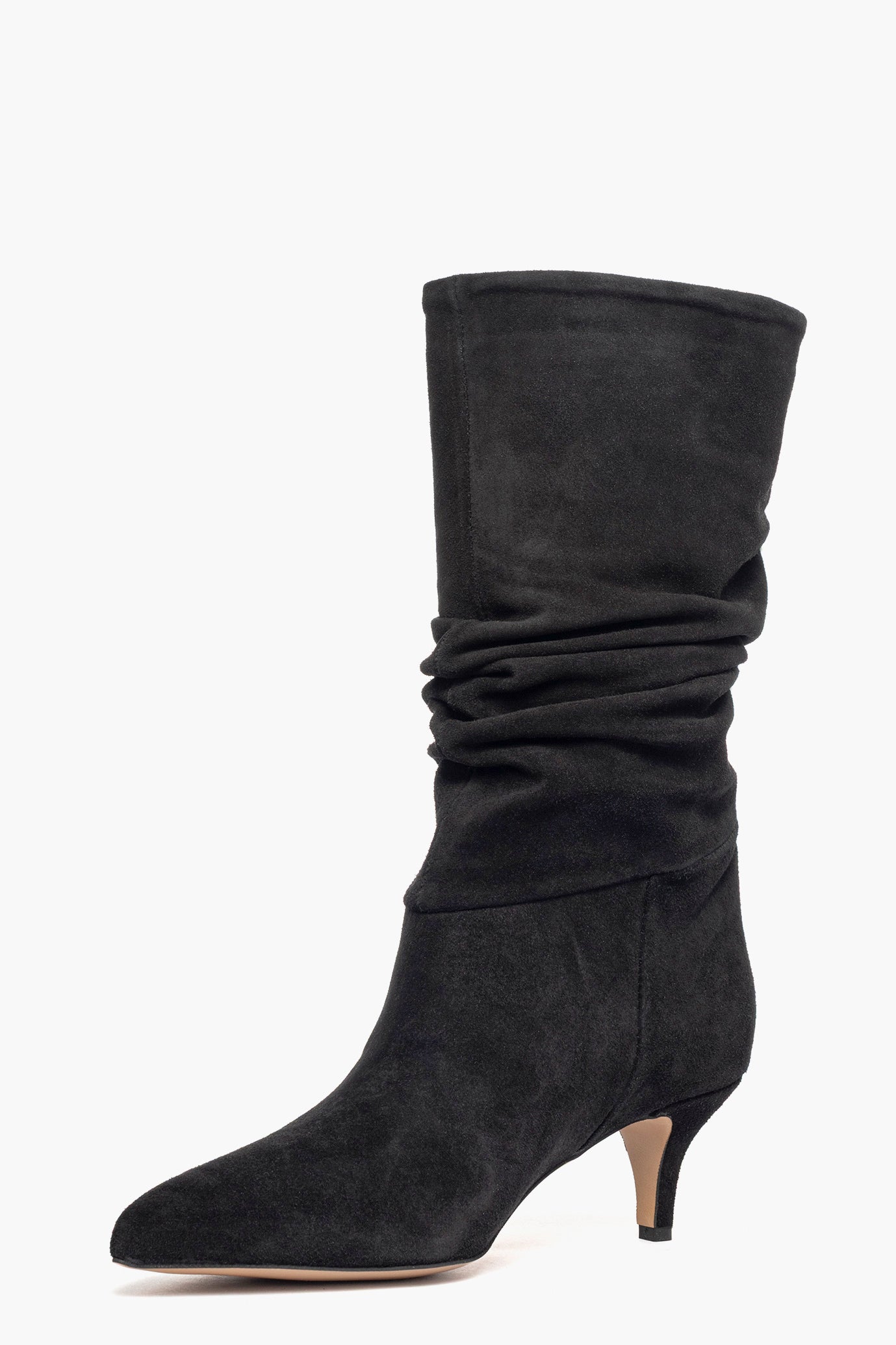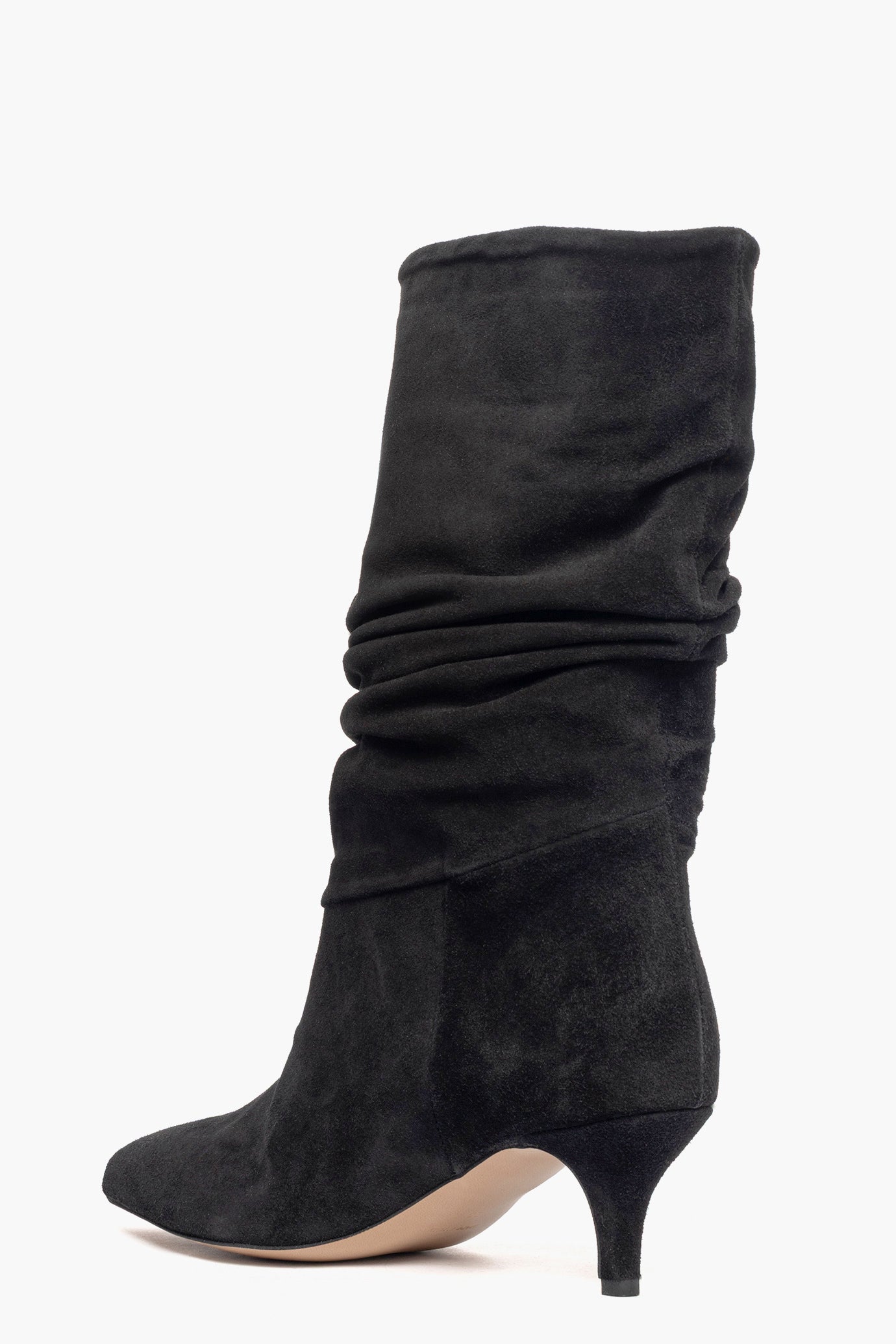 Stivali in camoscio nero, aggrappato, tacco rivestito, altezza 6 cm, interni e sottopiede in similpelle, privo di cerniera. Calzano regolari, punta leggermente stretta in avanti. Calzature realizzate in modo artigianale, rigorosamente Made in Italy.