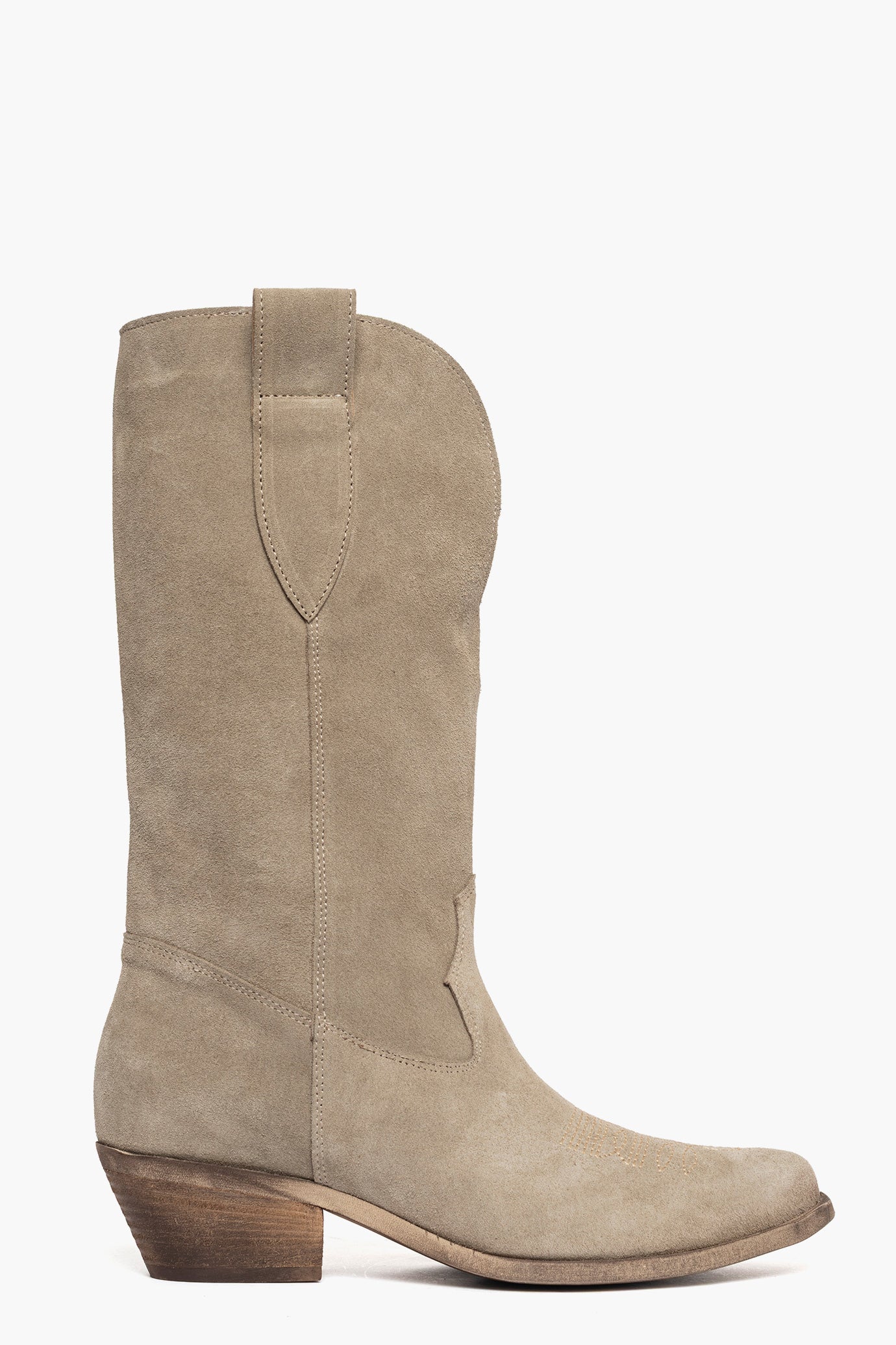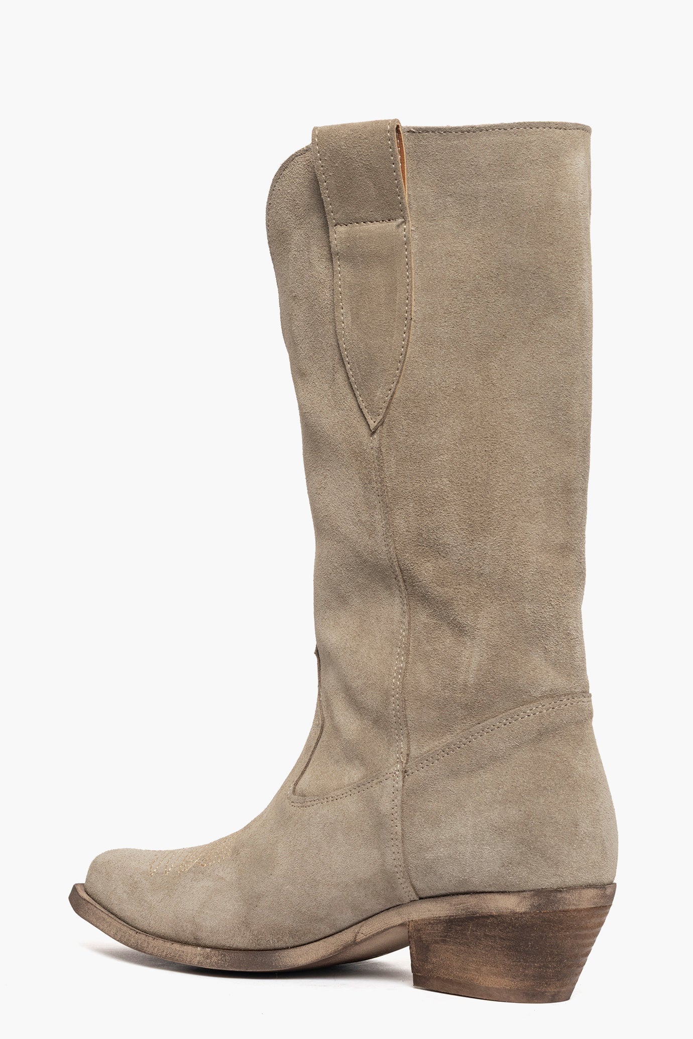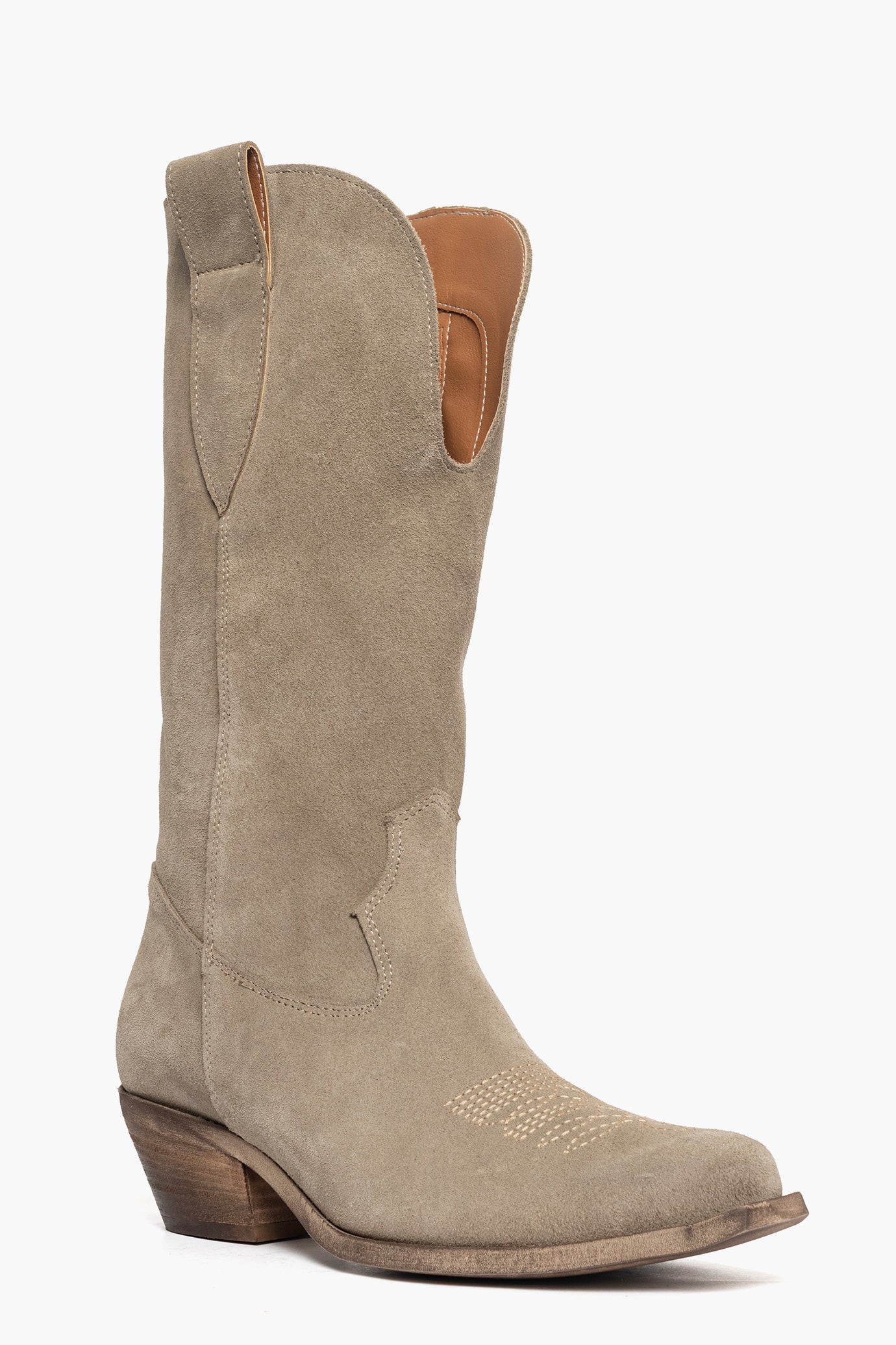 Stivali camoscio taupè con ricamo in punta, combinazione nata da due articoli oldwest e 288, scollo in avanti, interni in similpelle, suola in micro naturale spazzolato, altezza 5. Calzano regolari. Calzature artigianali, made in Italy.
