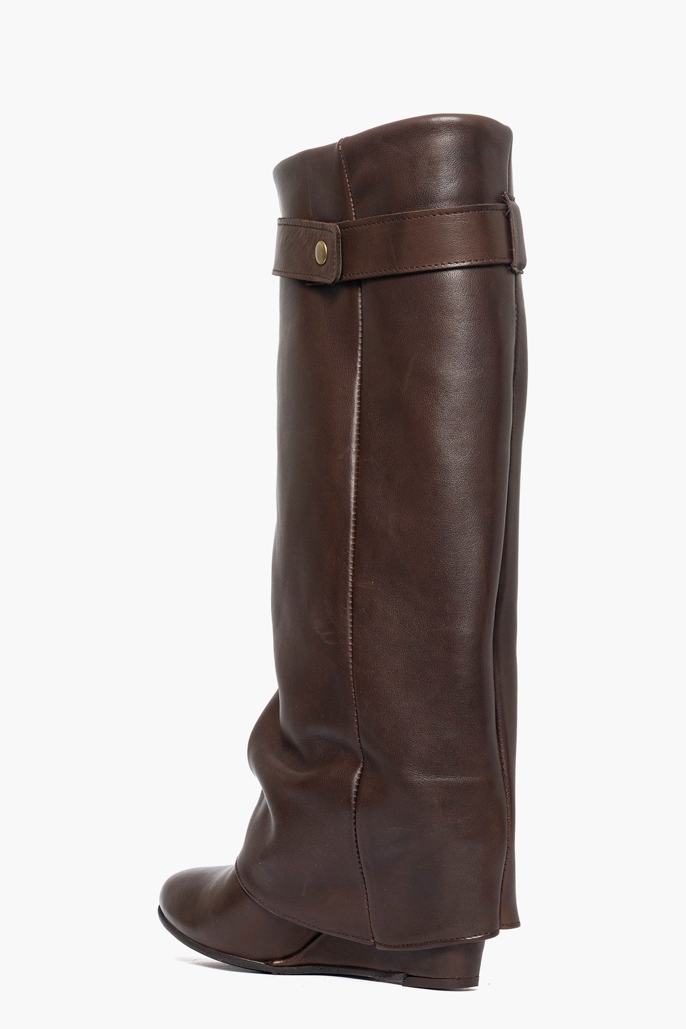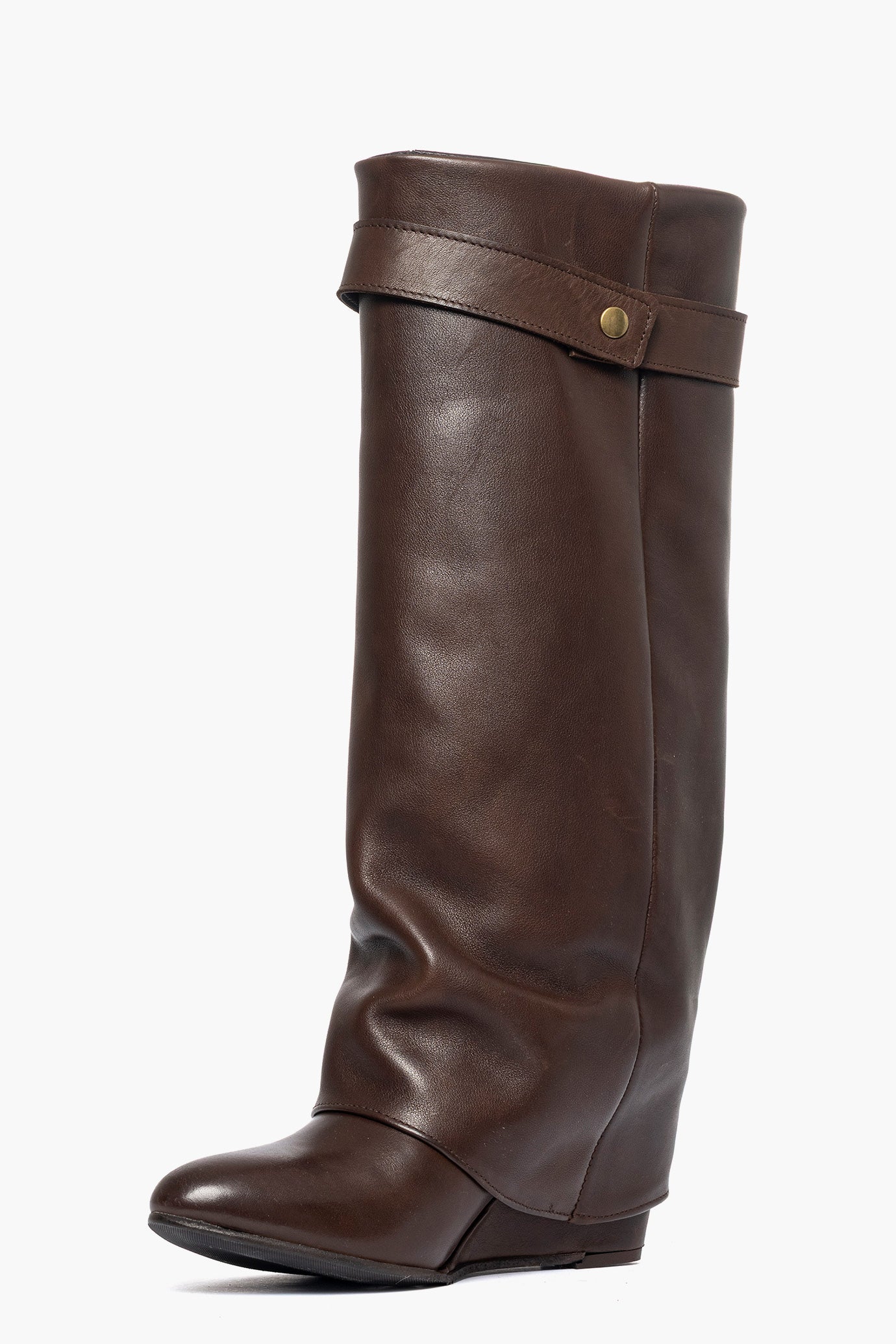 Stivale sopra al polpaccio in pelle testa di moro con risvolto e cintura con accessorio nel colore oro al lato esterno, zeppa rivestita, altezza 6/7. Calzano regolari, punta in avanti non stretta. Calzature artigianali, made in Italy.