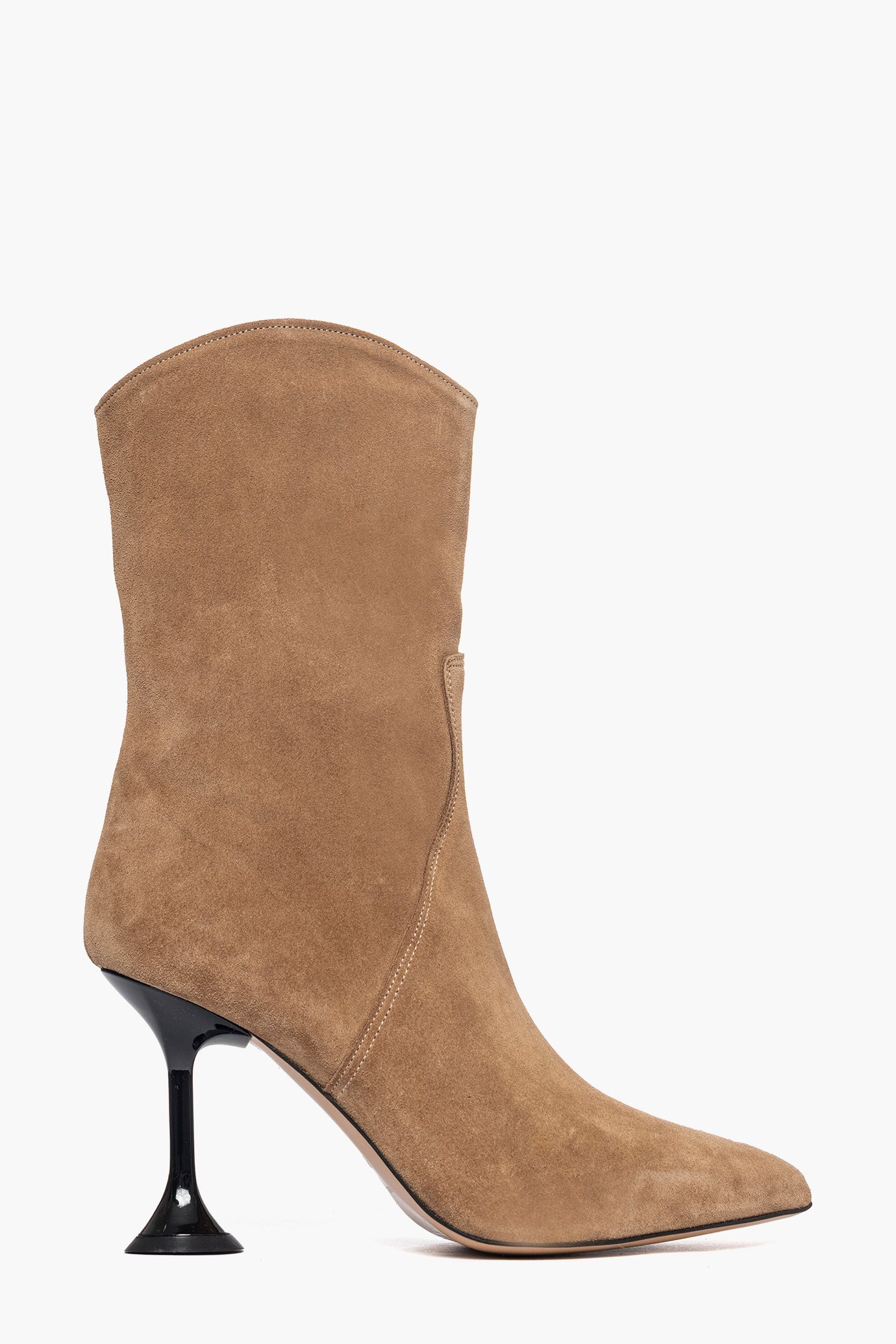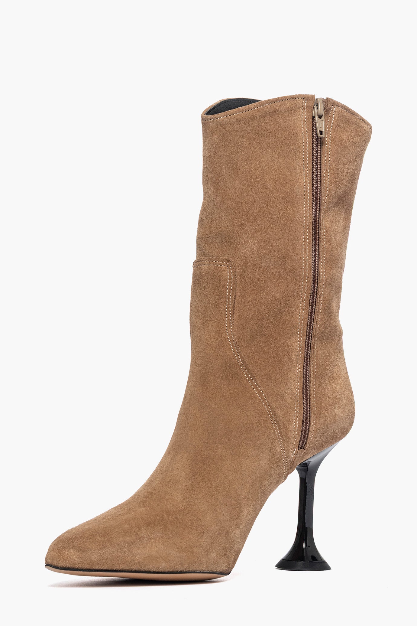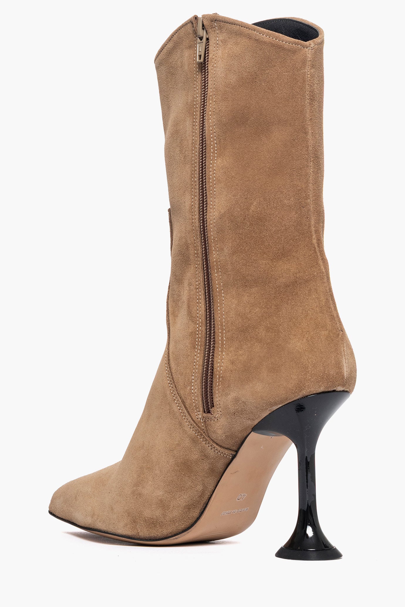 Stivaletti in camoscio taupè, con cerniera, aderenti alla caviglia, tacco lucido laccato, altezza 9/10 , interni in similpelle, punta stretta, calzano regolari. Calzature artigianali, made in Italy.