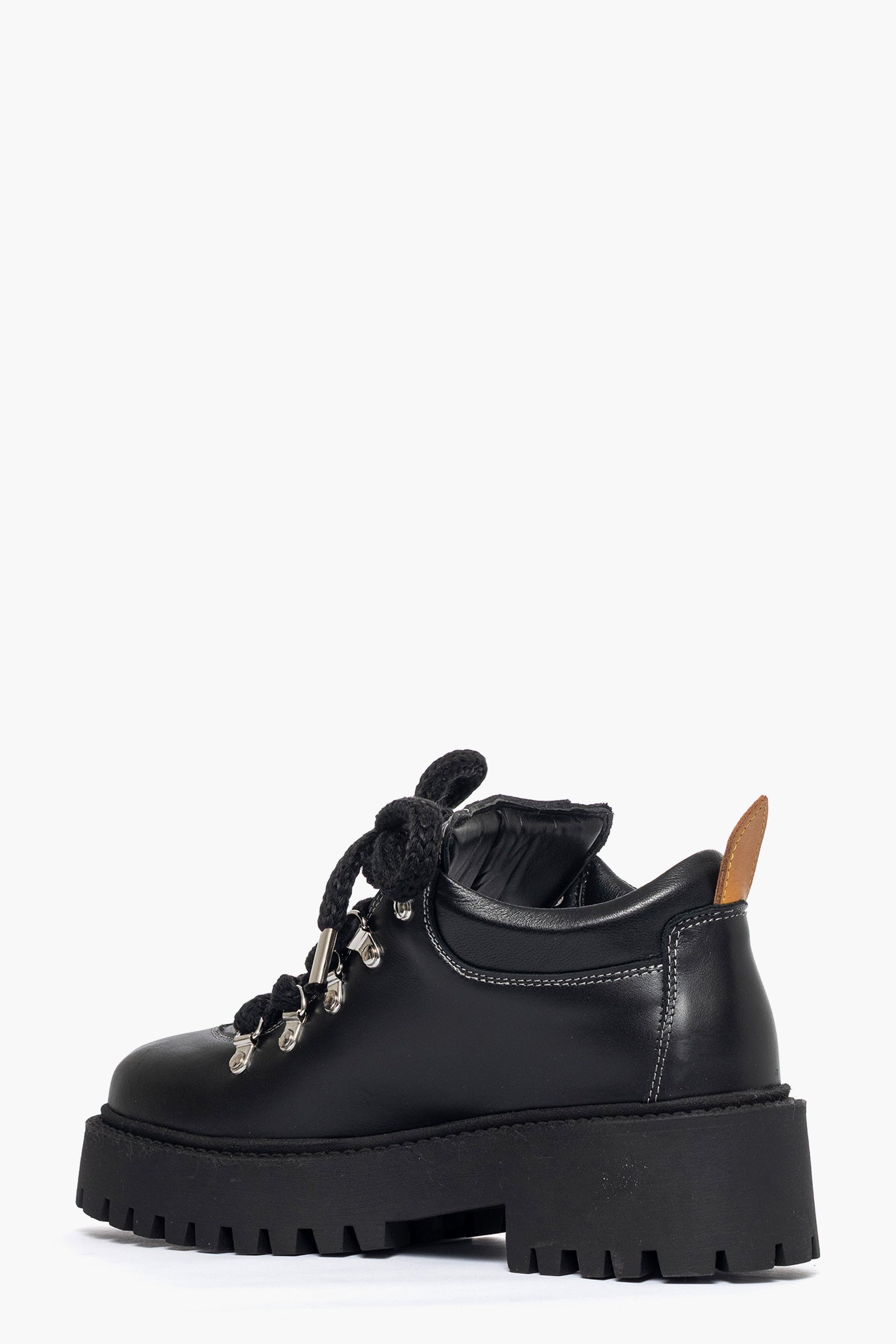 Scarpa in pelle nero e riporto pelle cuoio, interni in similpelle, lacci tondi neri, accessori nel colore argento e di lato un targa in pelle testa di moro, removibile, suola in nero altezza 5. Calzano regolari, calzature artigianali, made in Italy.