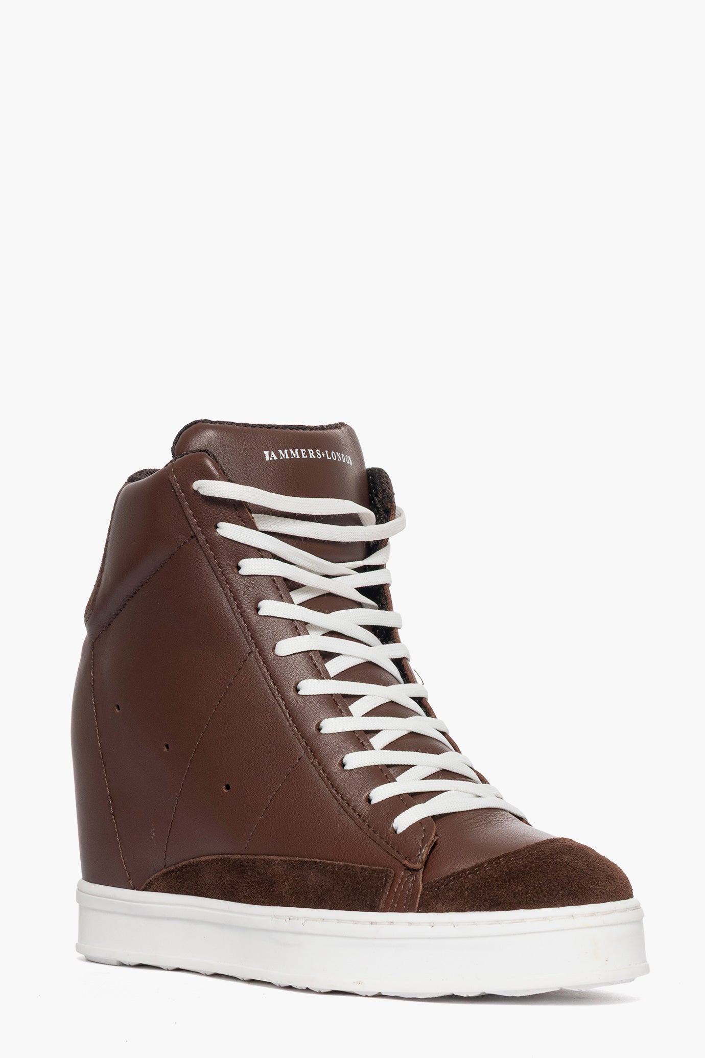 Sneakers con zeppa interna alta 9 cm, in pelle testa di moro e camoscio testa di moro, lacci bianchi, interni in spugna marrone, suola in gomma bianca, stampa a caldo Jammers London sulla linguetta. Calzata comoda, taglia italiana. Calzature realizzate artigianalmente, rigorosamente made in Italy.