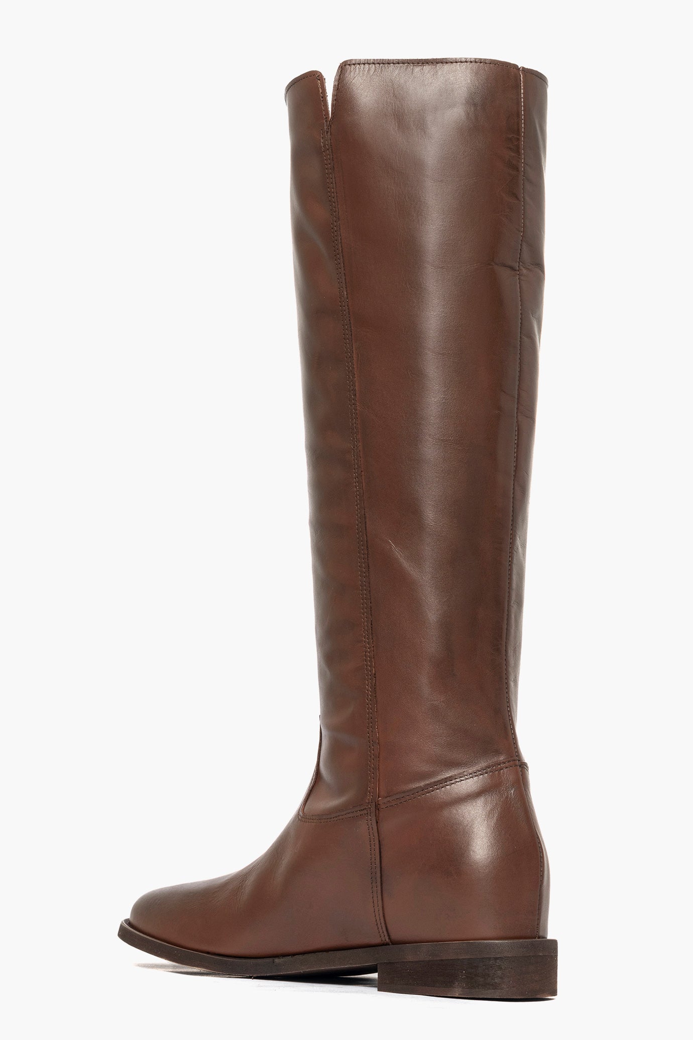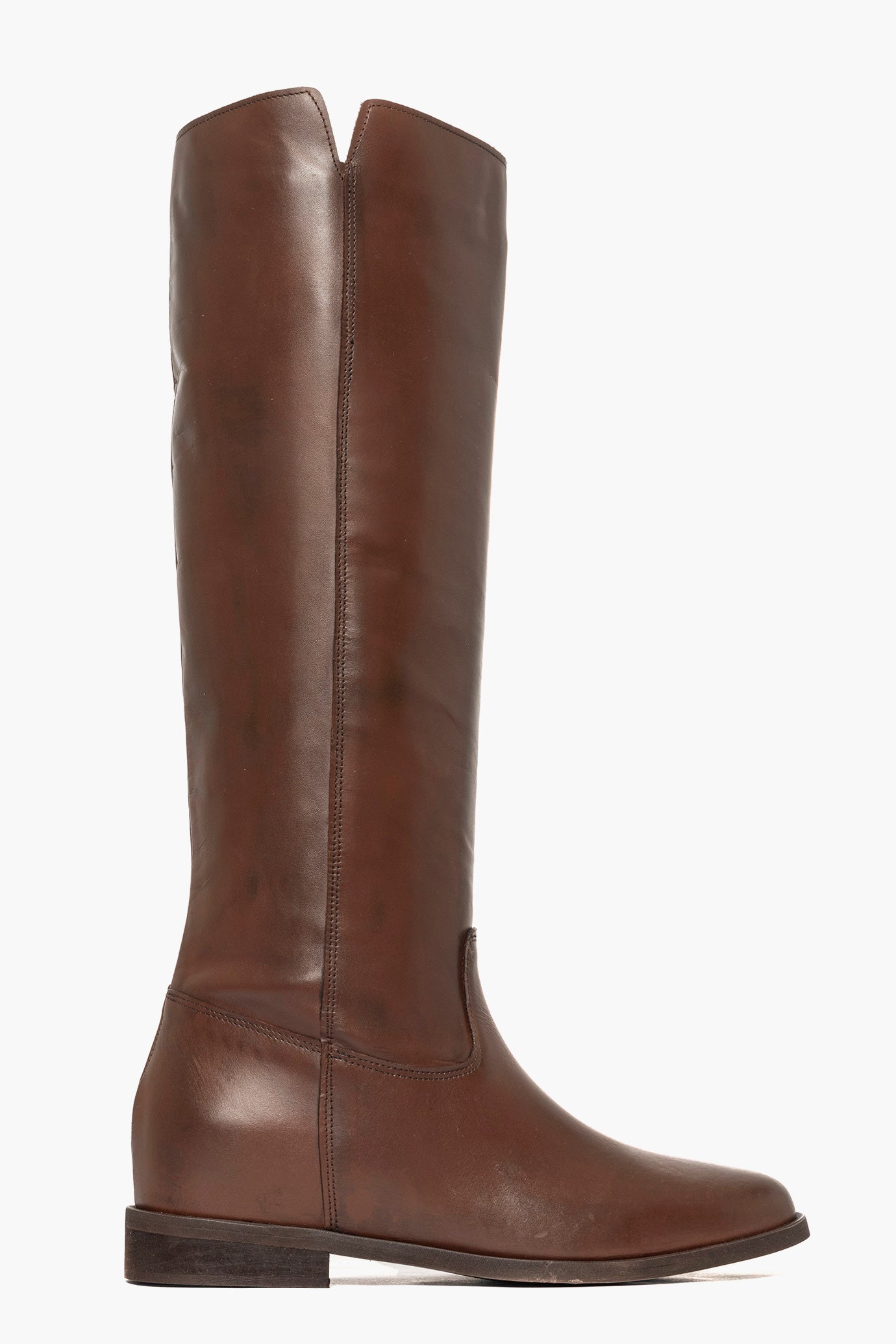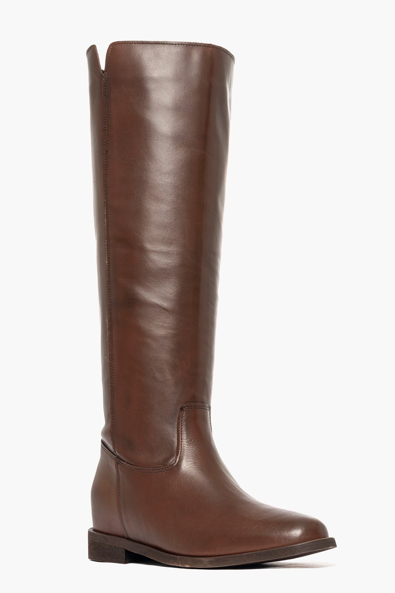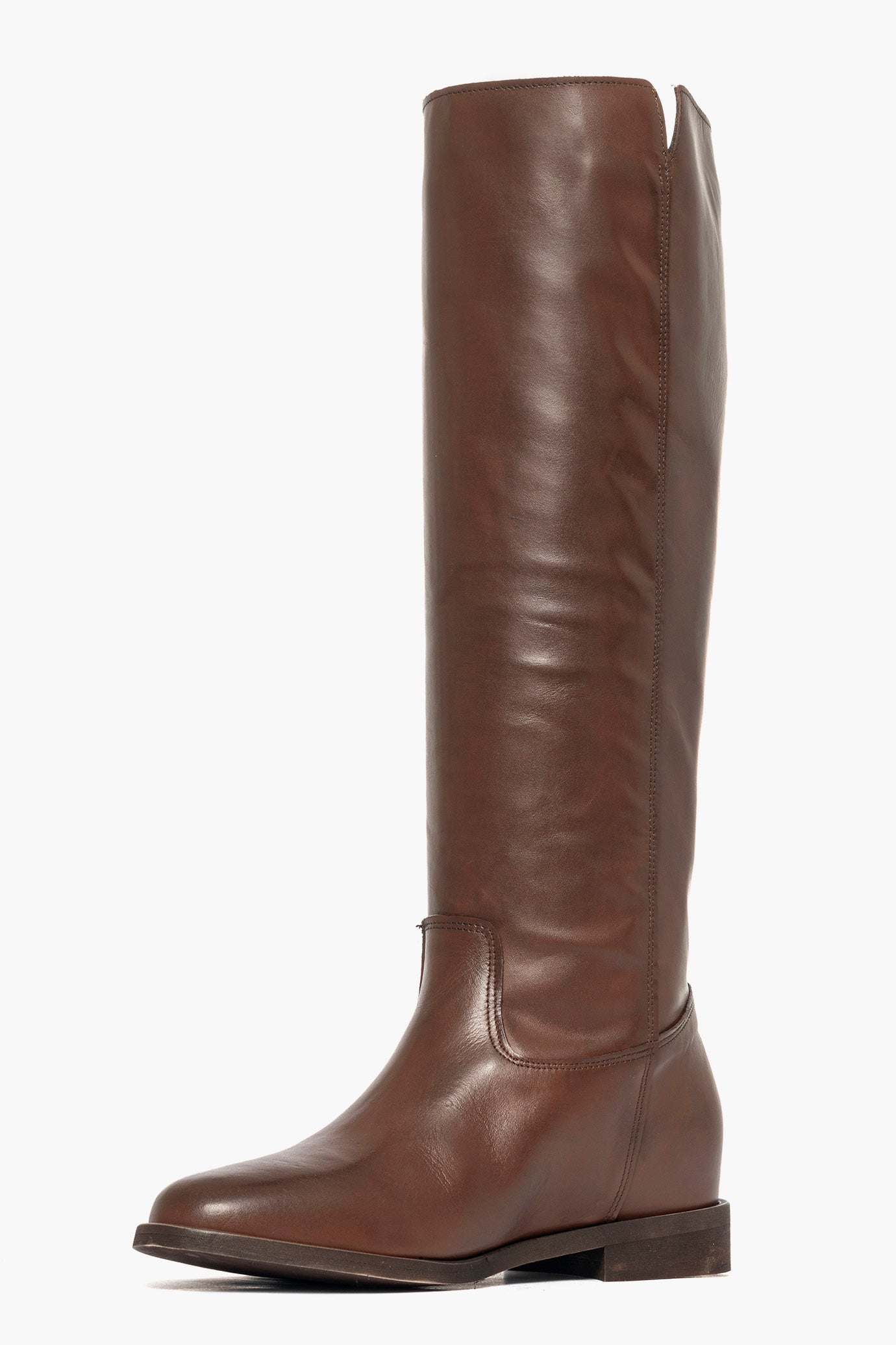 Stivali al ginocchio pelle marrone con rialzo, altezza totale 8, interni e sottopiede in similpelle , punta tonda . Calzano regolari. Calzature artigianali, made in Italy.