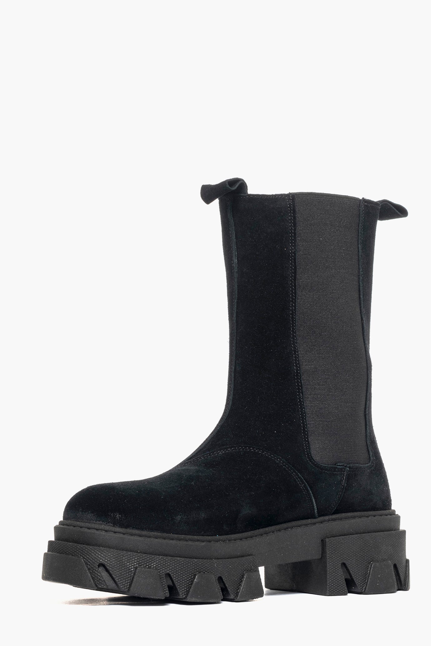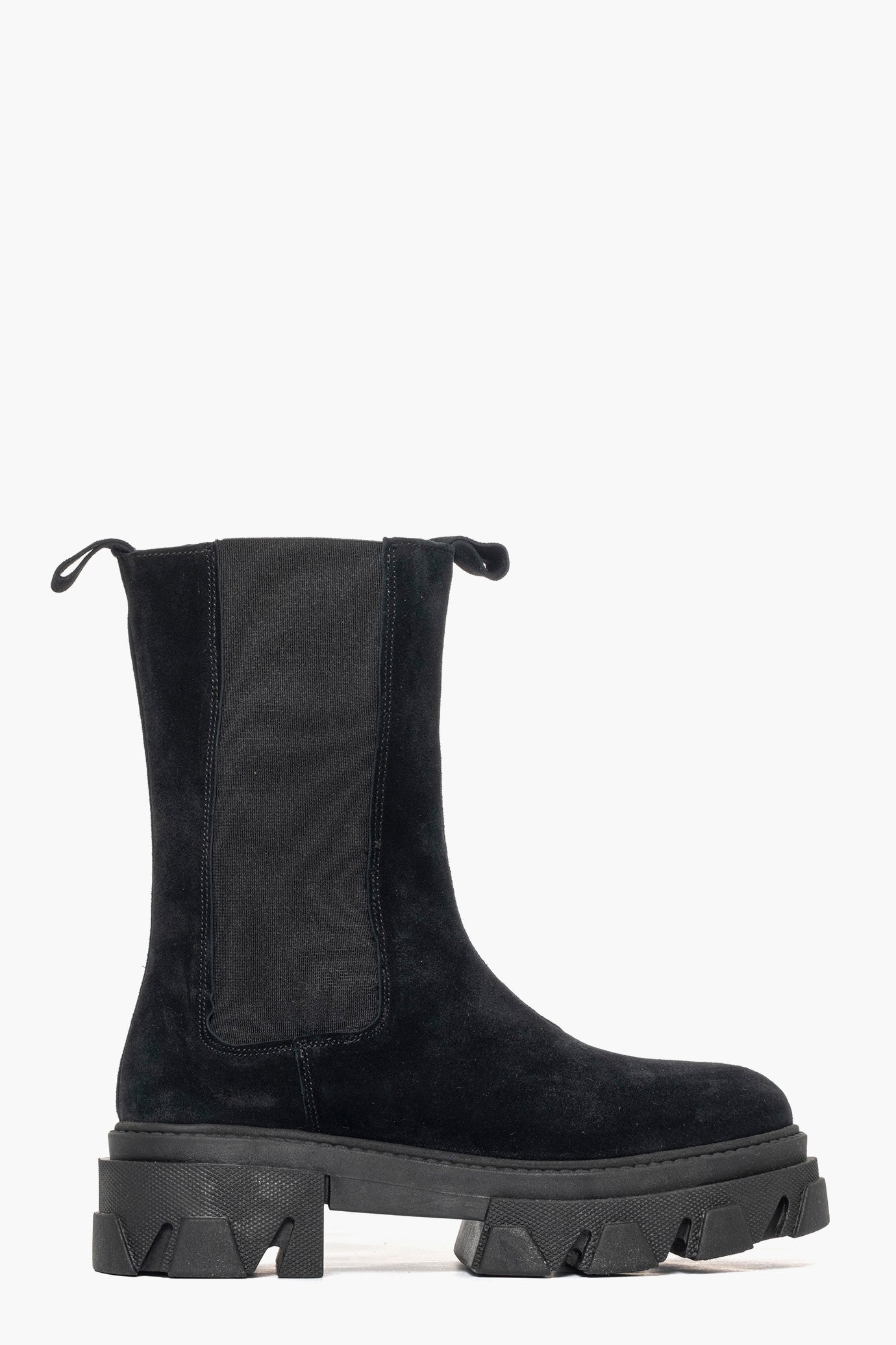 Stivaletti in camoscio nero con elastici ai lati in tinta, interni e sottopiede in similpelle, suola in gomma nel colore nero, altezza 5 cm. Calzata regolare, taglia italiana. Calzature realizzate in modo artigianale, rigorosamente Made in Italy.