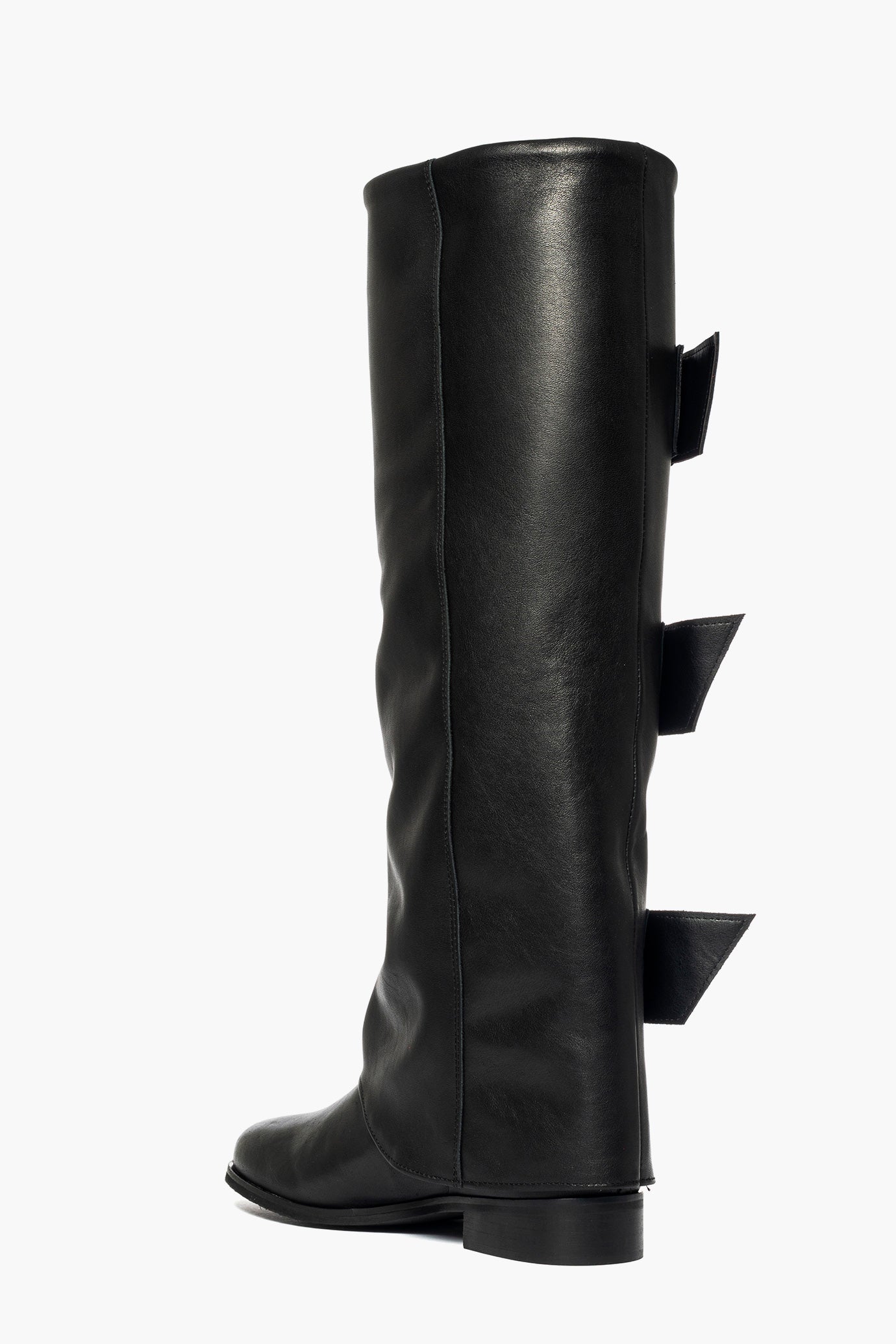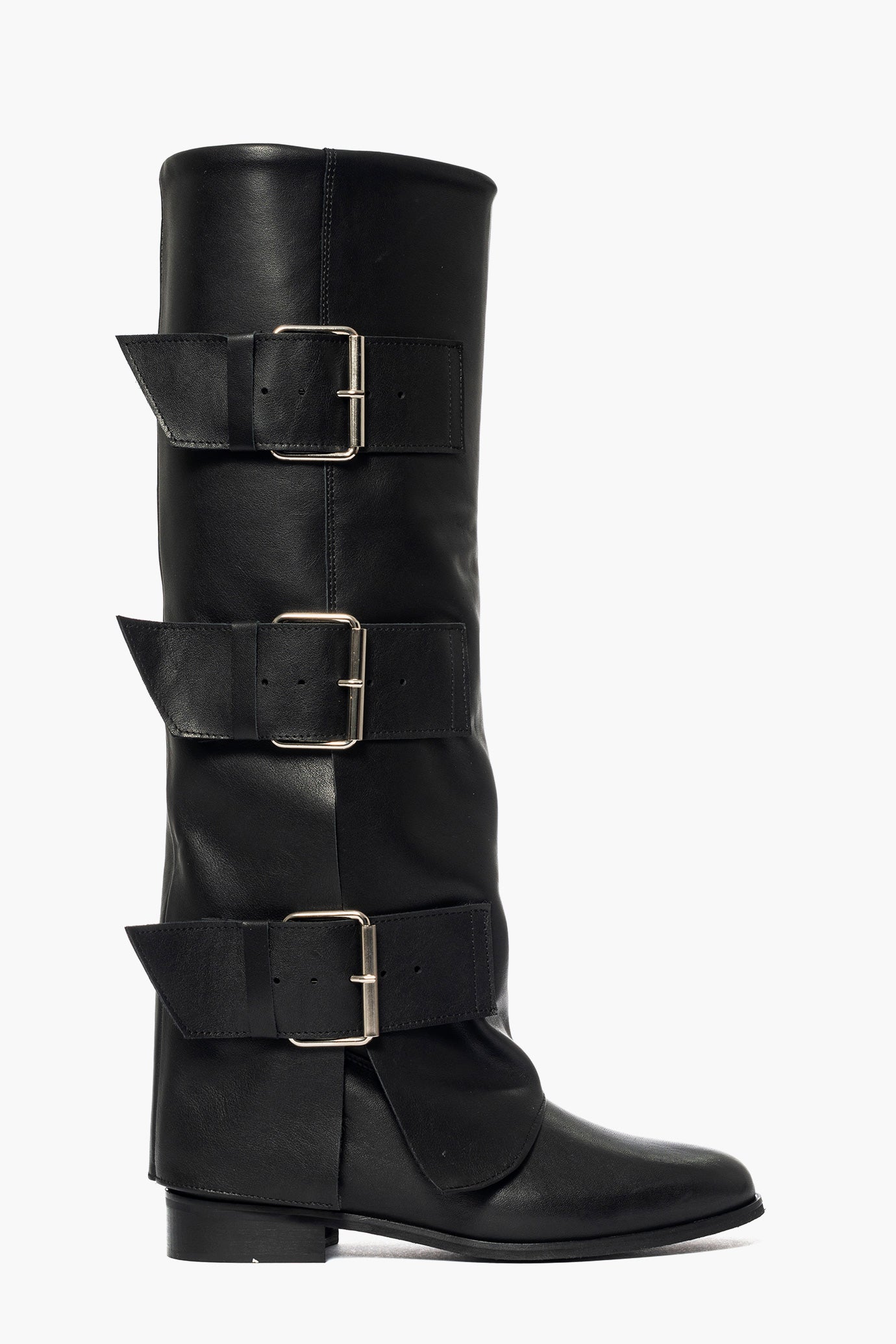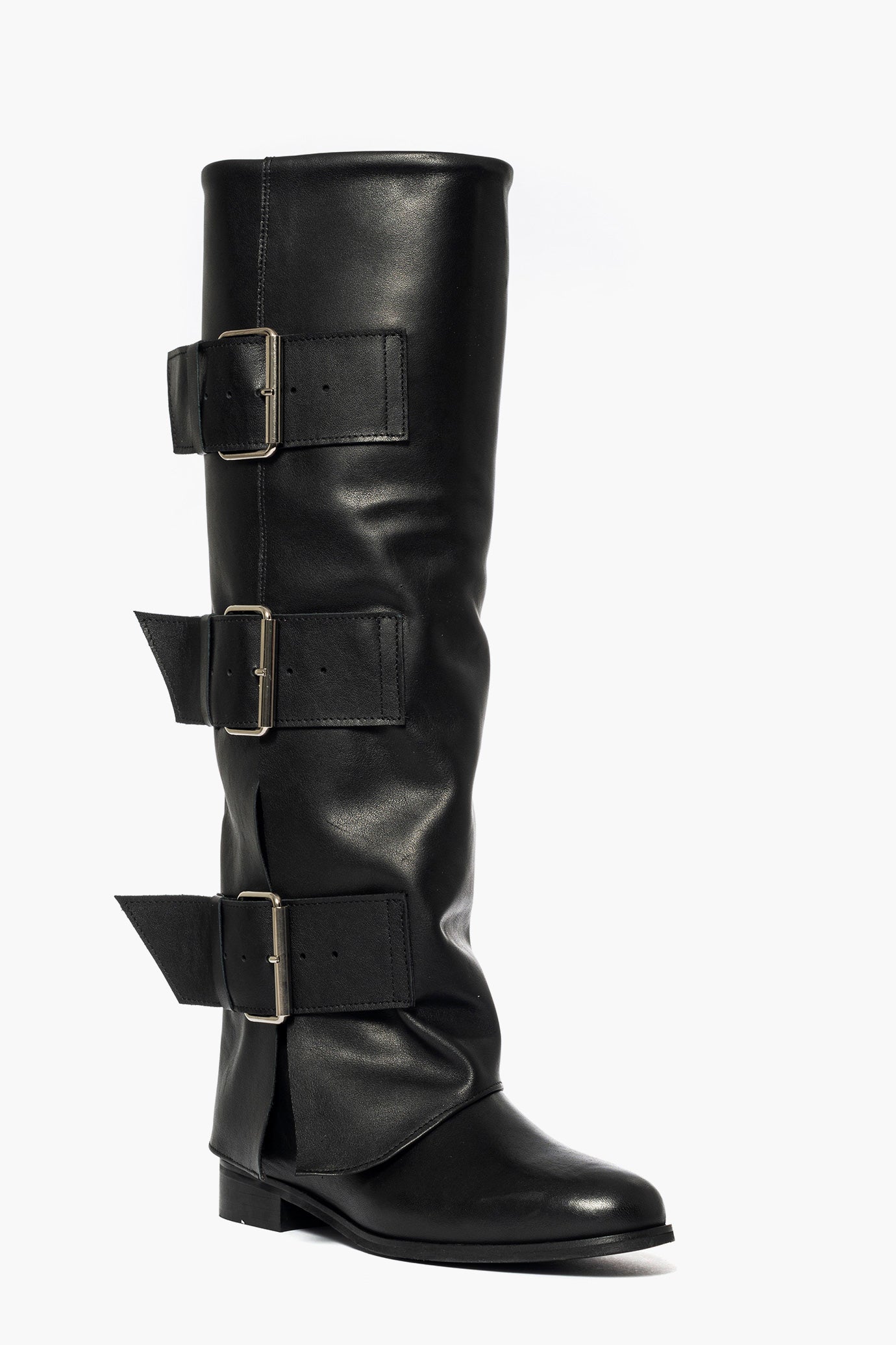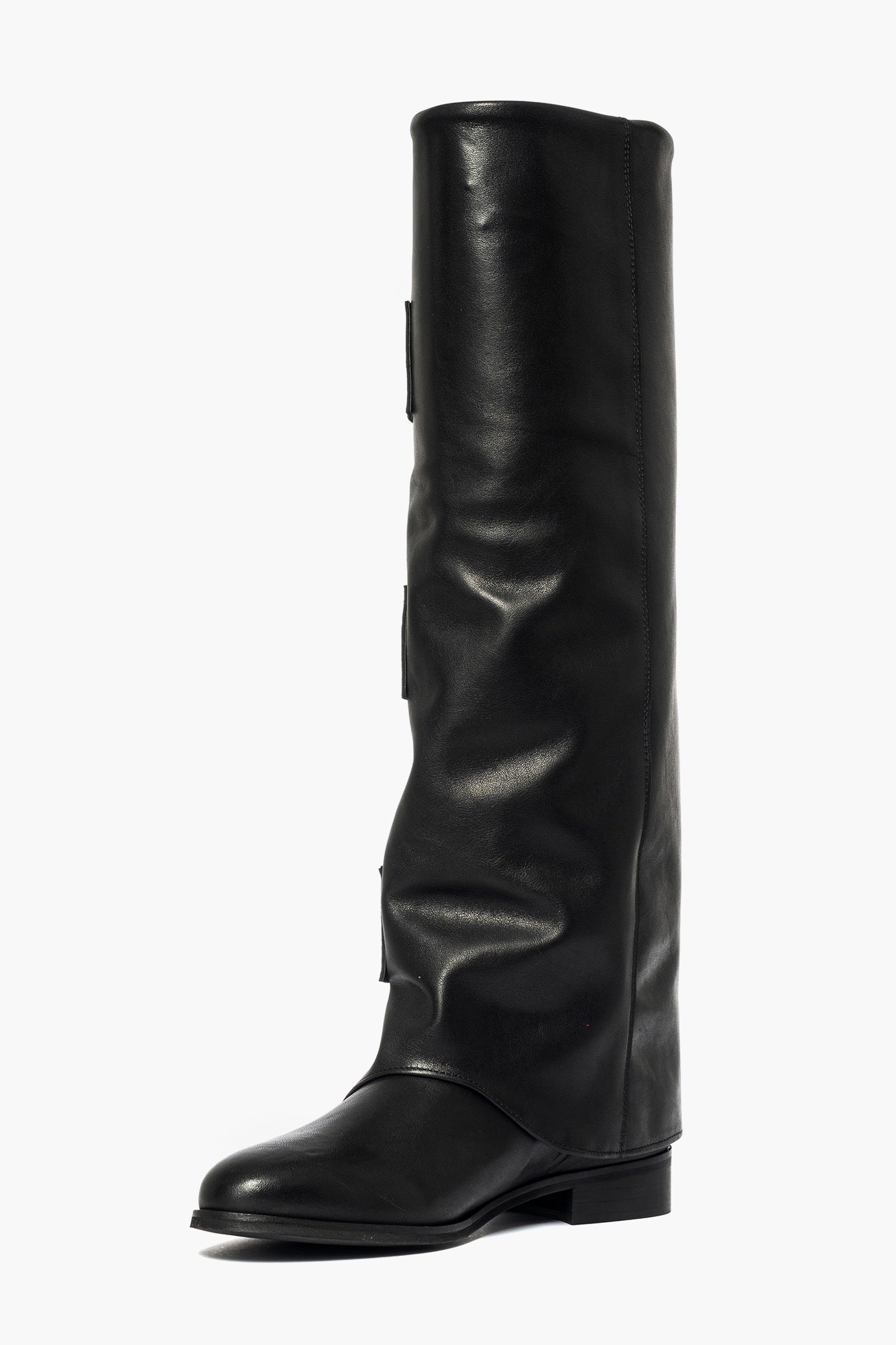 Stivale in pelle nero  con risvolto e fibbie nel colore argento esterno piede, interni in similpelle, suola nel colore, tacco altezza 3. Calzano regolari, punta tonda in avanti.